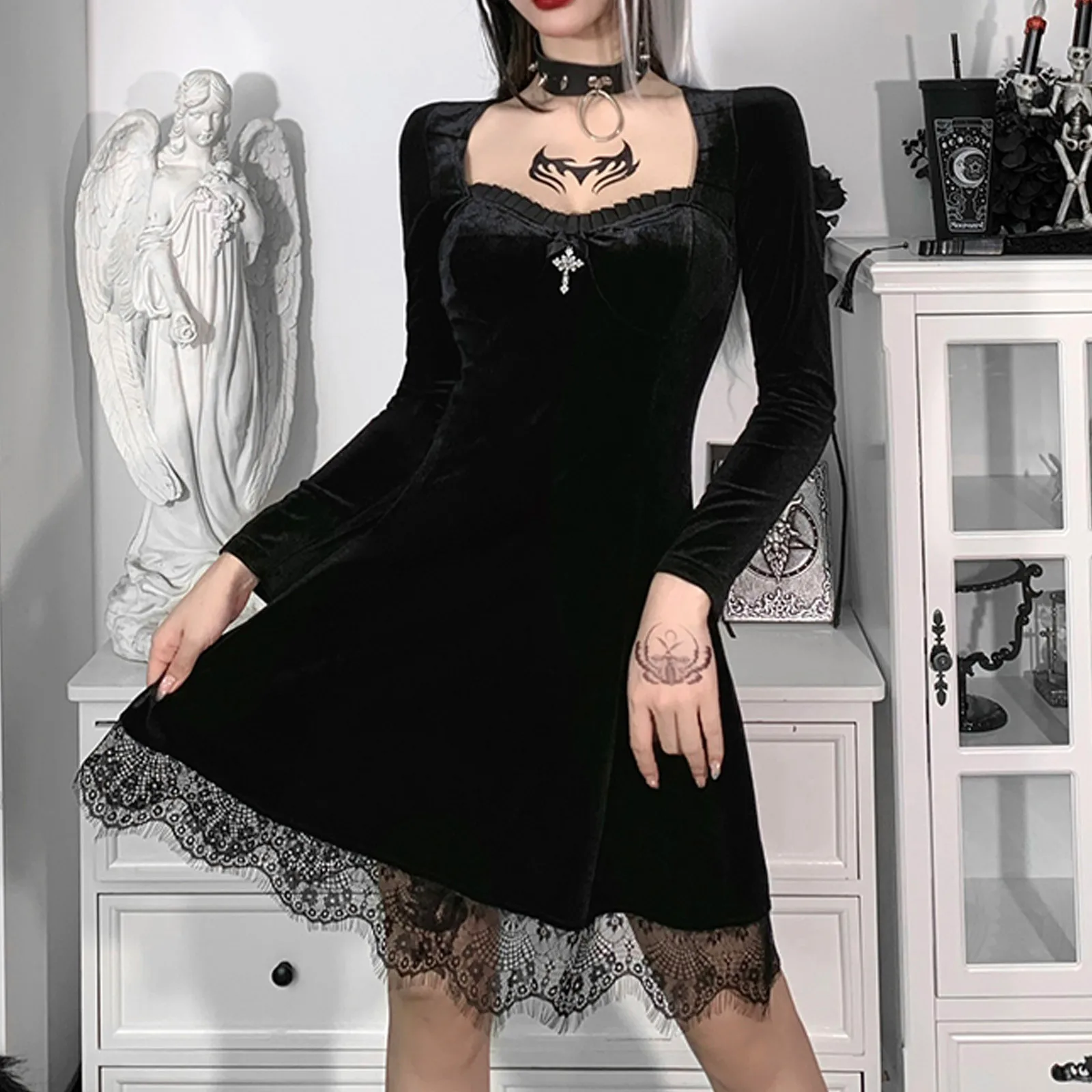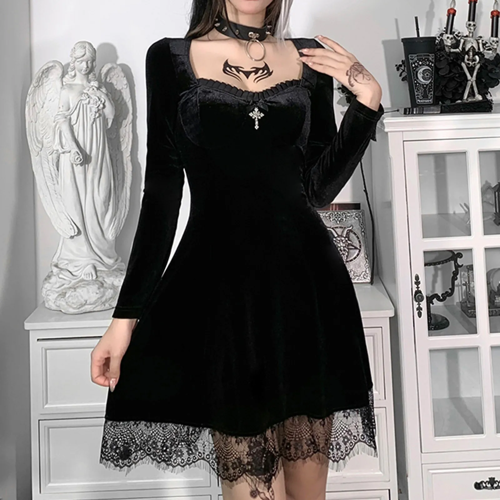 Черное кружевное вечернее платье 40 #, женское платье с длинным рукавом и квадратным вырезом, готическое платье в стиле панк, однотонное винтажное платье-трапеция в стиле Харадзюку на шнуровке