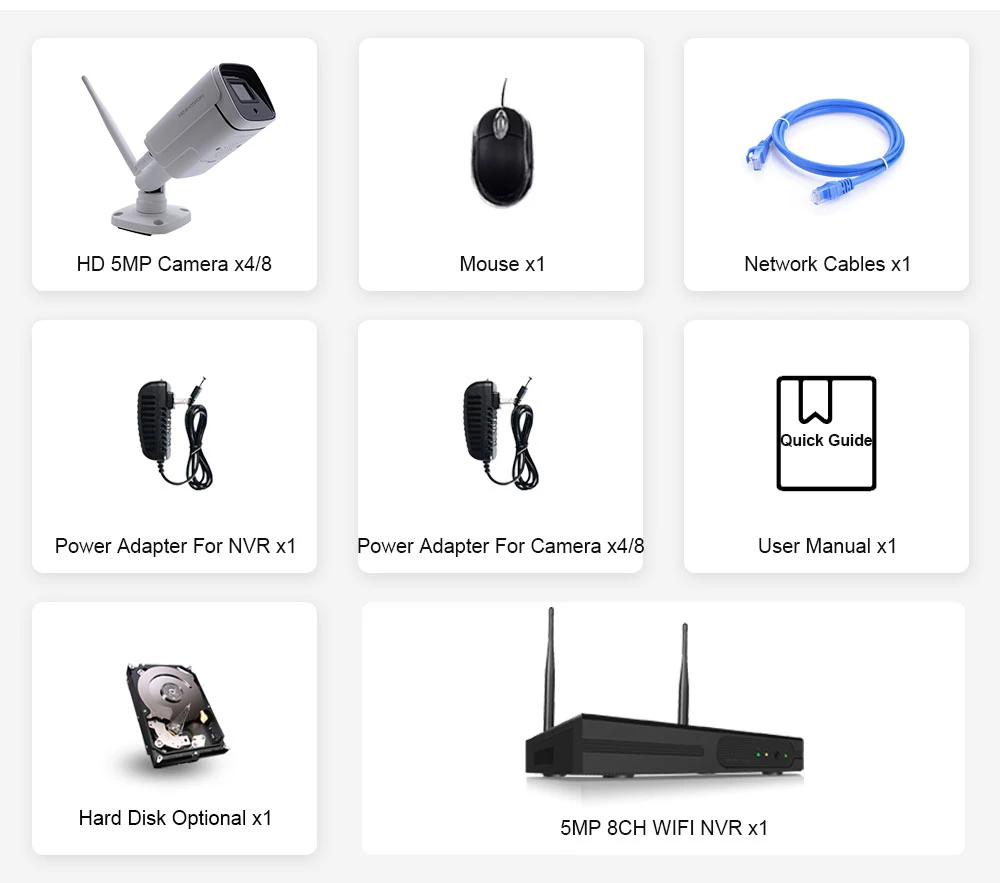 1x 8CH 5MP беспроводной WiFi NVR рекордер;4/8x Ультра HD 5MP беспроводная WiFi пуля ip-камеры;4/8x источник питания для камеры;1x источник питания для NVR;1 usb-мышь (подарок);1x 3 фута 1 м Ethernet кабель (подарок);1x быстрая инструкция;Жесткий диск опционально!