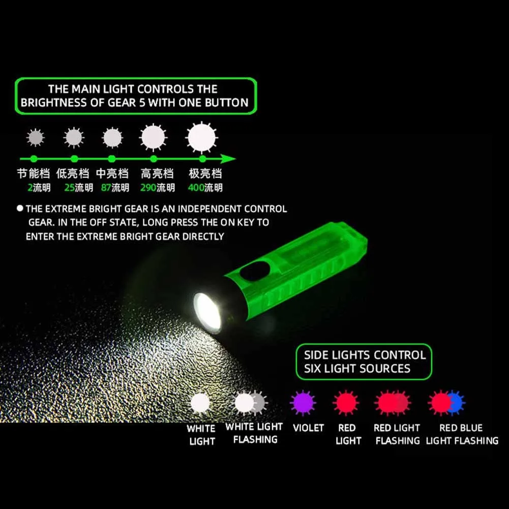 400LM светодиодный сисветильник фонарь, боковая лампа, красный, синий, фиолетовый свет, брелок, мини-фонарик, фотовспышка, внешнее оборудование для кемпинга
