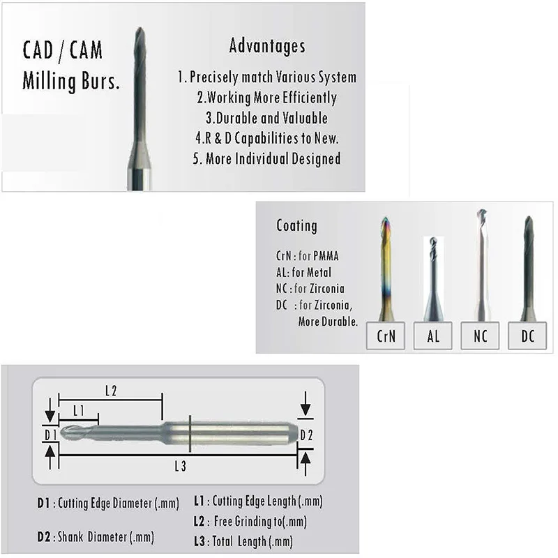 ПокрытиеCrN: для PMMAAL: для металлаNC: для цирконияDC: для циркония, более прочный