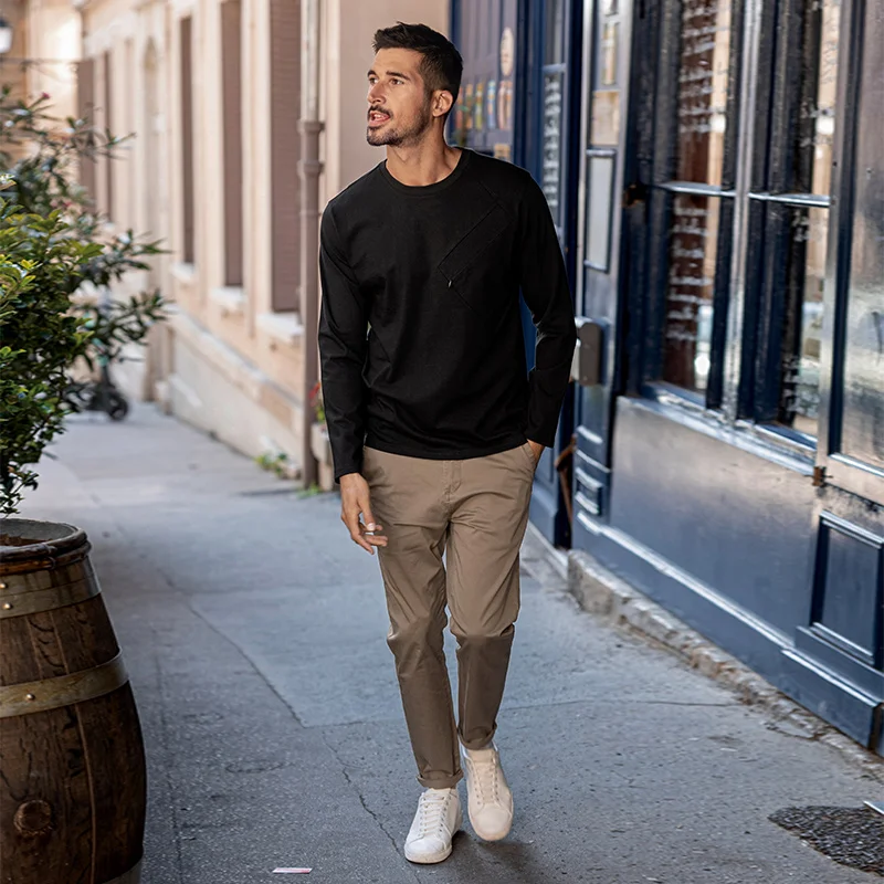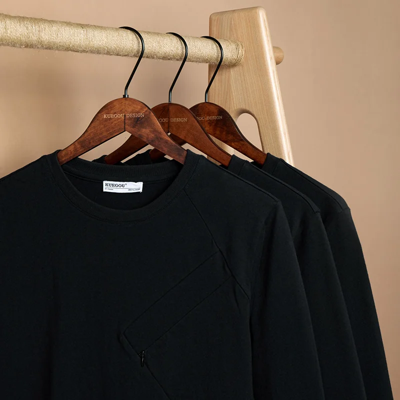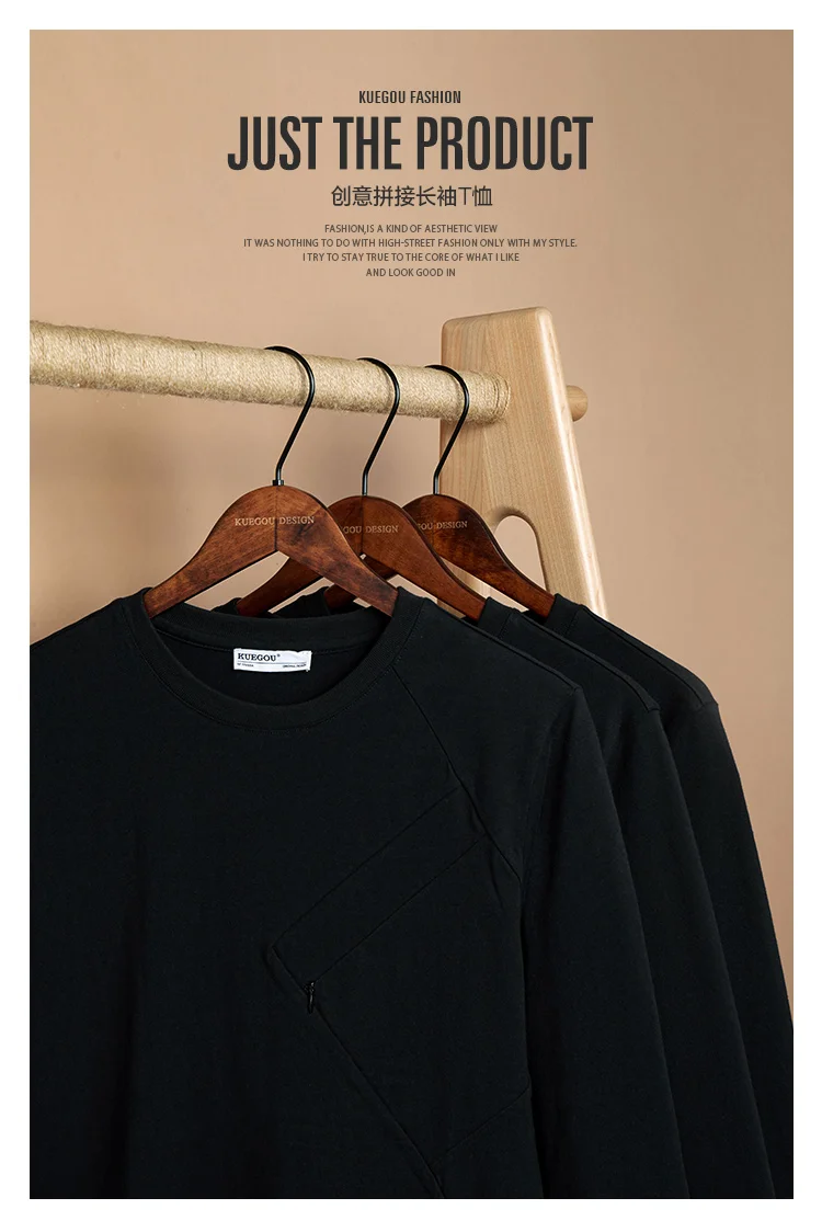 Мужская футболка с длинным рукавом KUEGOU, черная Винтажная футболк...