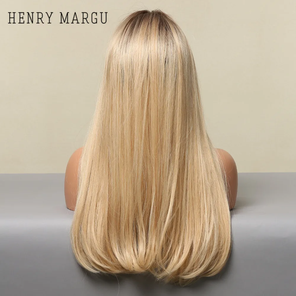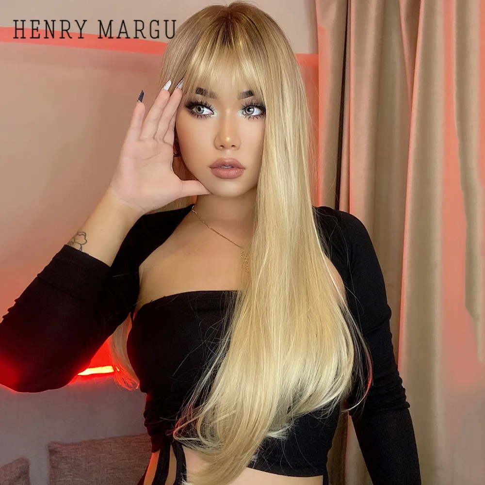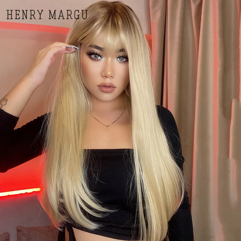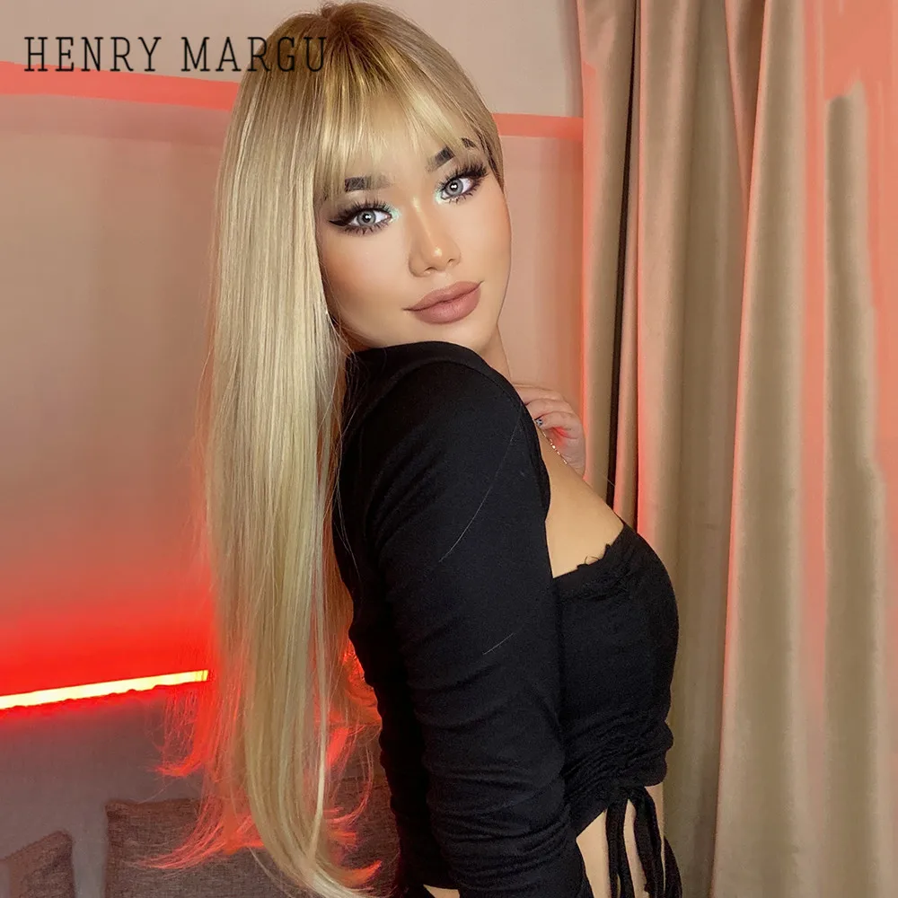 Генри MARGU длинные прямые синтетические парики с челкой блондинка парик из натуральных волос с темные корни крой, подходит для ежедневного Косплэй вечерние термостойкий парик