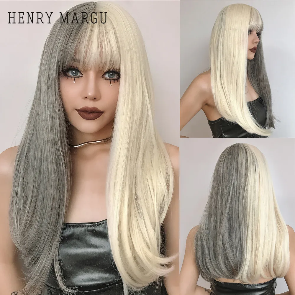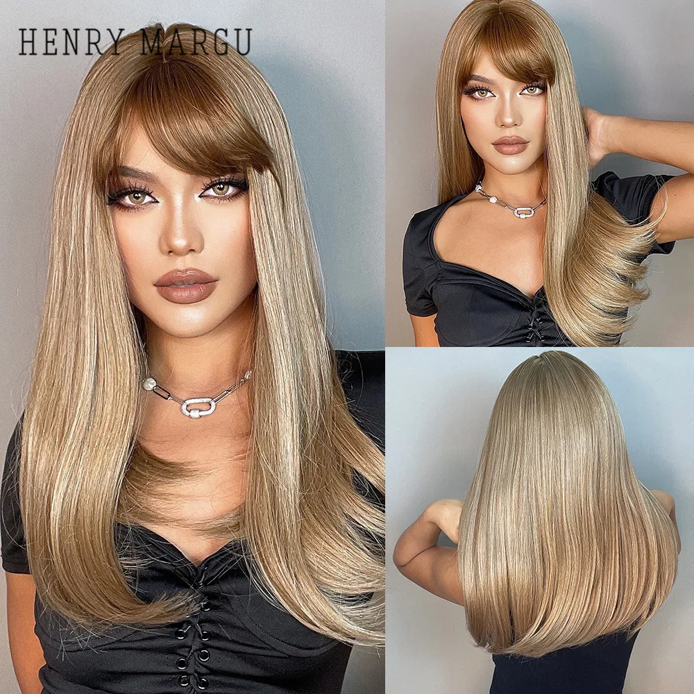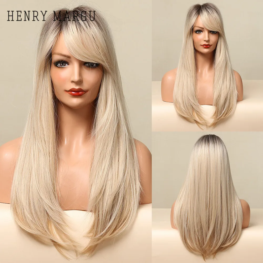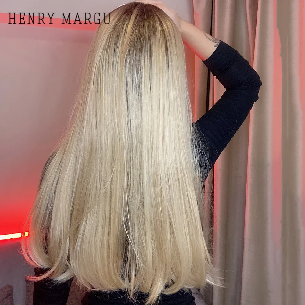 Генри MARGU длинные прямые синтетические парики с челкой блондинка парик из натуральных волос с темные корни крой, подходит для ежедневного Косплэй вечерние термостойкий парик