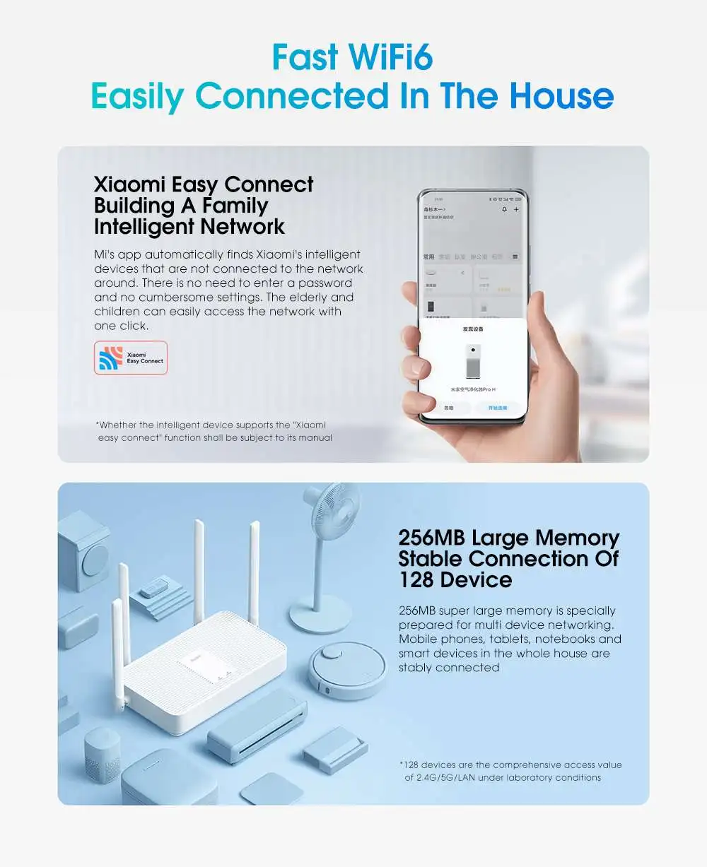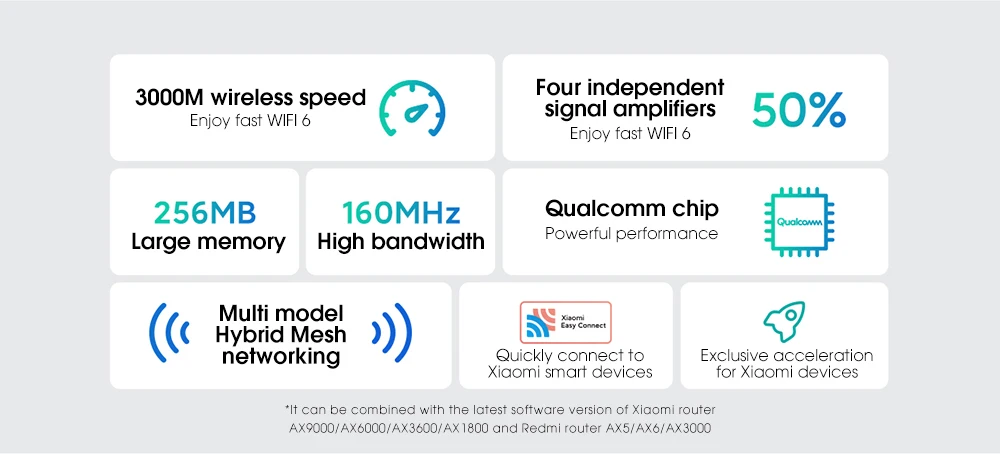 * 256 Мб большой памяти.* 5G 160 МГц с высокой пропускной способностью.* OFDMA эффективная передача.* 4-независимый усилитель сигнала.* Мощная Быстрая сеть WiFi6, 3000M.* Сетчатая сеть покрывает весь дом.* Независимый двигатель ускорения сети.* Внешняя 4 * высокоусиленная всенаправленная антенна