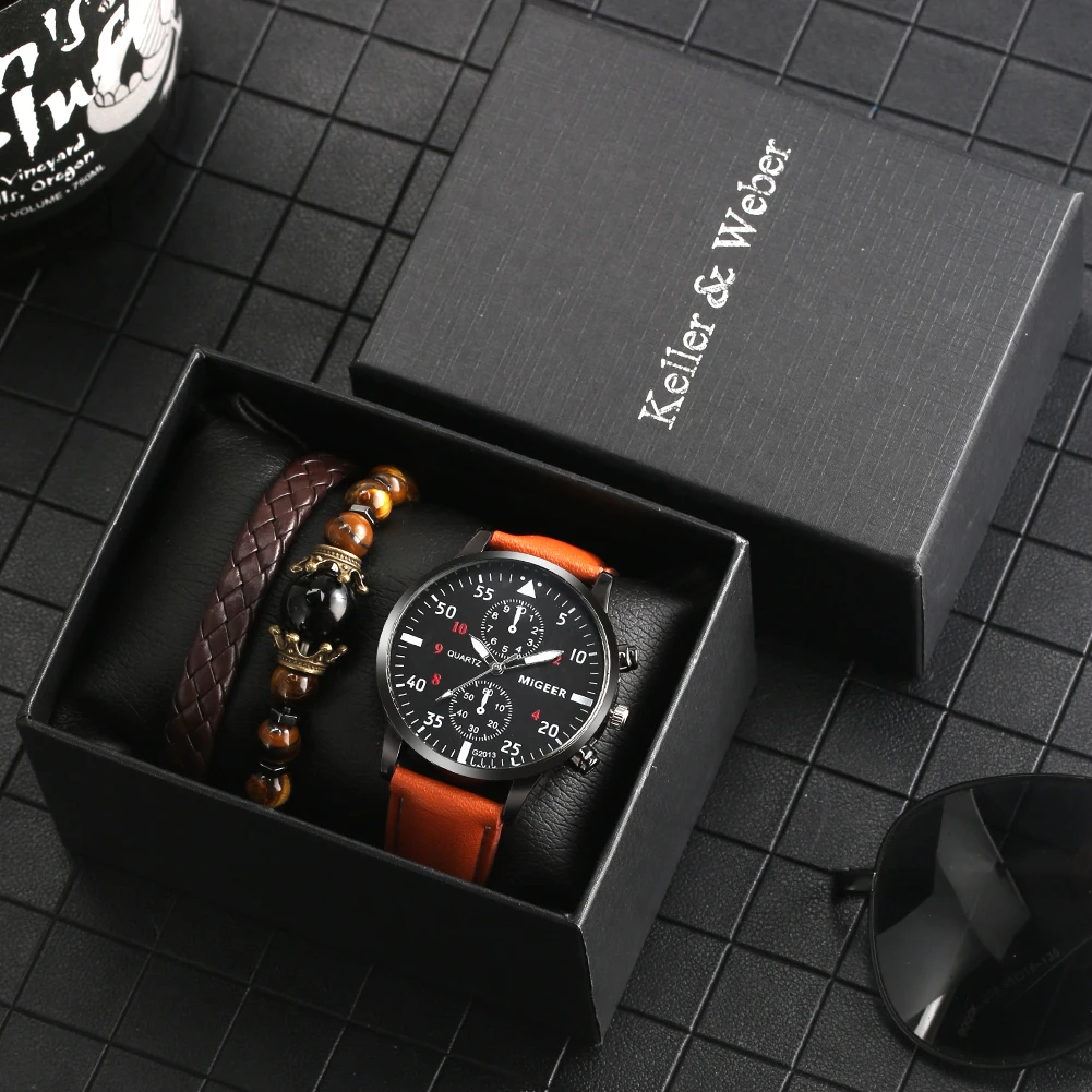 Часы мужские кварцевые с кожаным ремешком, Модный подарочный набор,...