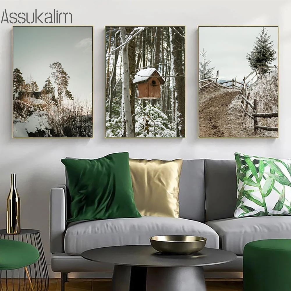 Настенная картина с изображением зимнего леса, снежный пейзаж, дере...