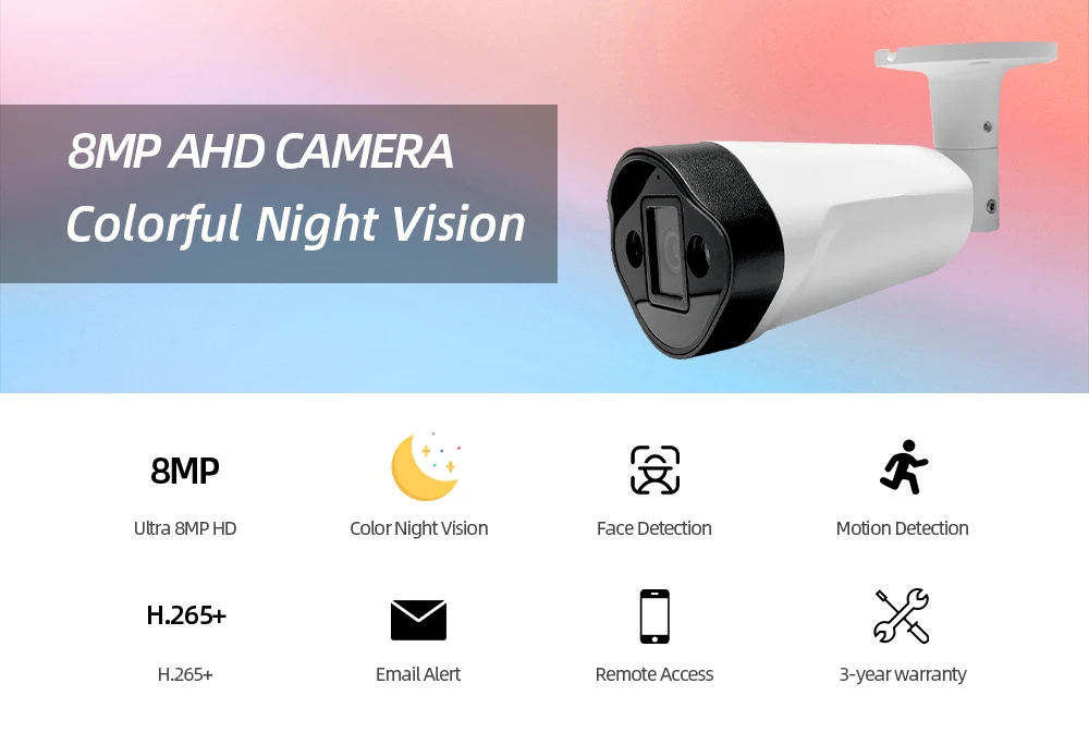 1, Ультра HD 8 Мп дисплей высокой четкости;2. Ультра HD 8MP AHD камера, металлический материал, IP66 водонепроницаемый, подходит для внутреннего и наружного использования; Пыленепроницаемый, надежный для домашней безопасности;3. Улучшенное H.265 Сжатие видео, подключи и работай, простота установки;4. Поддержка распознавания лица, записи лица, воспроизведения лица, обеспечивает ультра высокое разрешение видео наблюдения, обеспечивая максимальную детализацию и четкость доступны;5. Поддержка IR-CUT переключателя двойного фильтра, днем и ночью для достижения мониторинга, цвет не является частичным искажением цвета;6. Поддержка Full HD дневного ночного видения;7. Поддержка расстояния передачи составляет 500 метров;8. Поддержка обнаружения движения, оповещения по электронной почте, воспроизведения видео;9. Поддержка Android,Iphone,Ipad, ПК, P2P просмотра;10. Удаленный доступ в любом месте, в любое время;