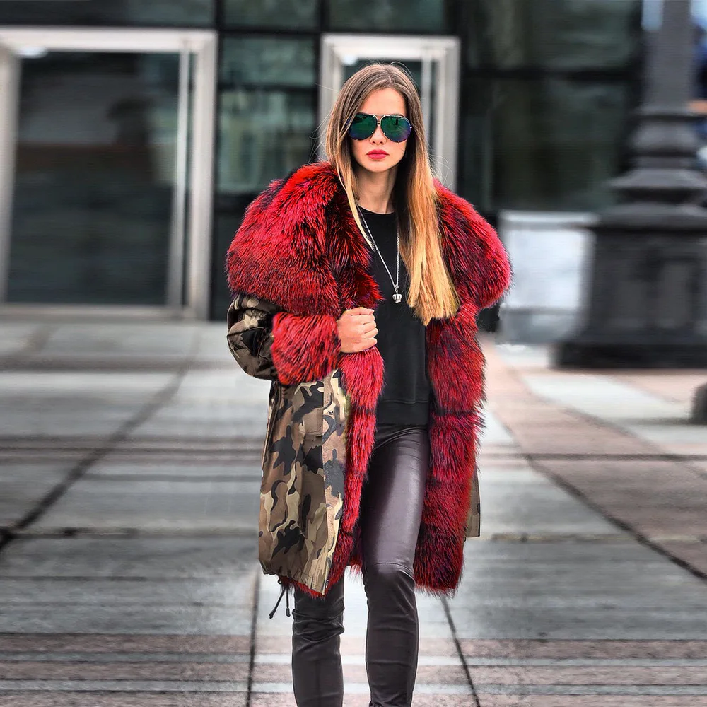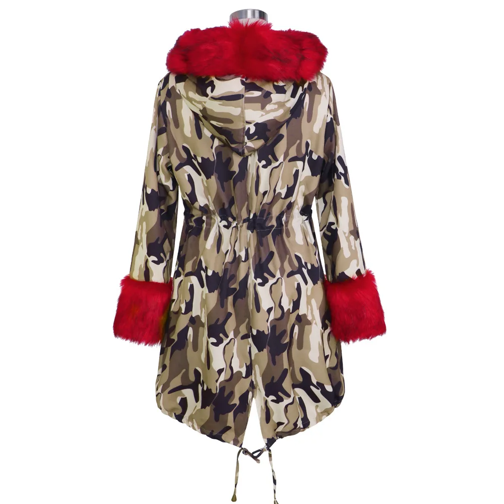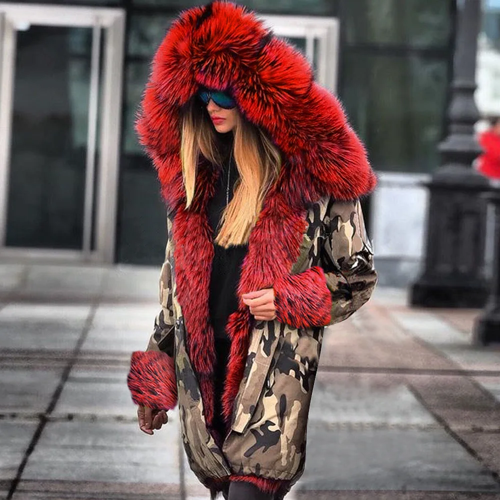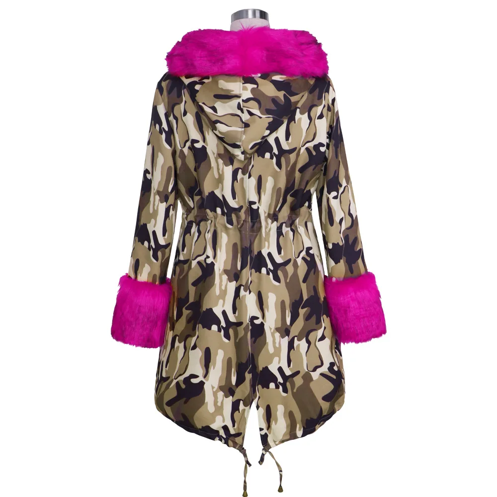 Парка из искусственного меха, длинная камуфляжная шапка в европейск...