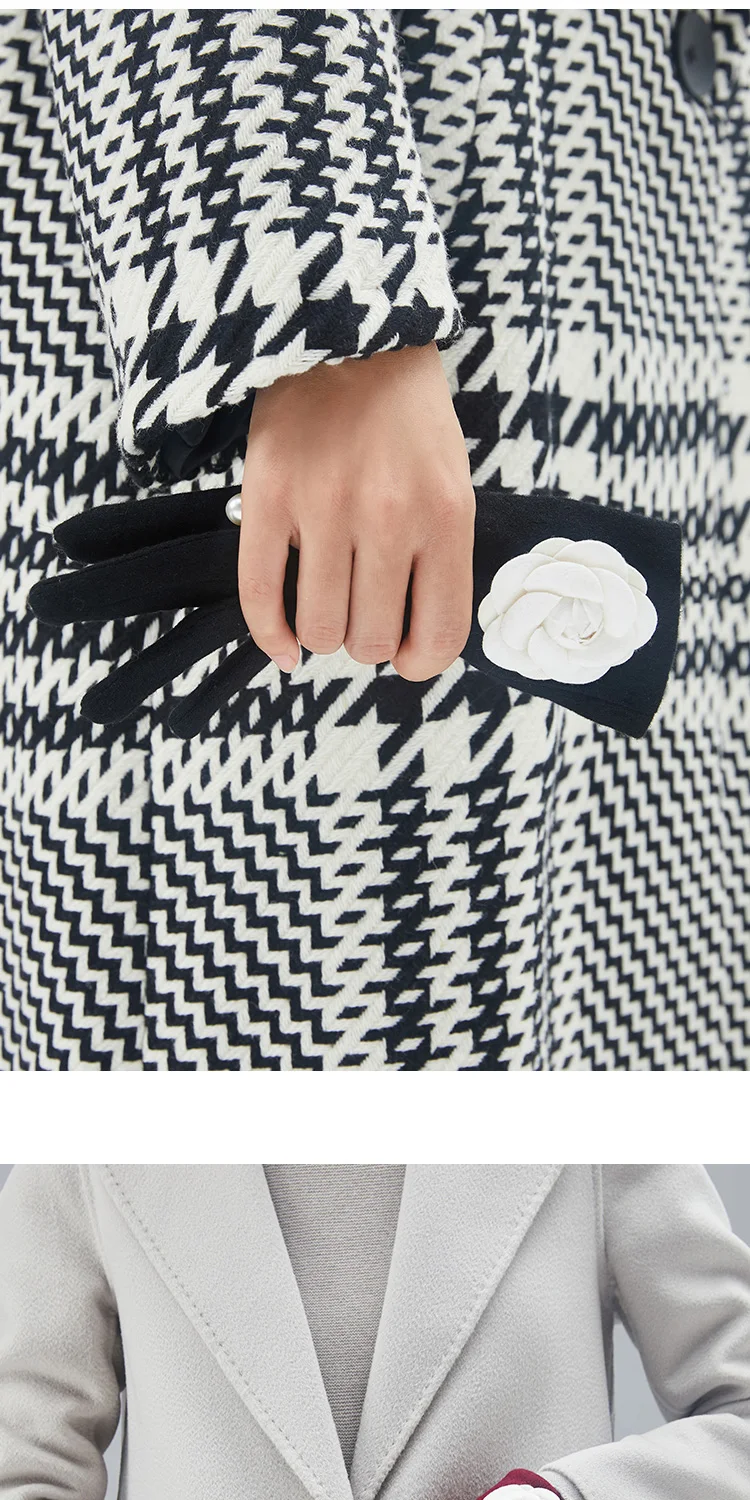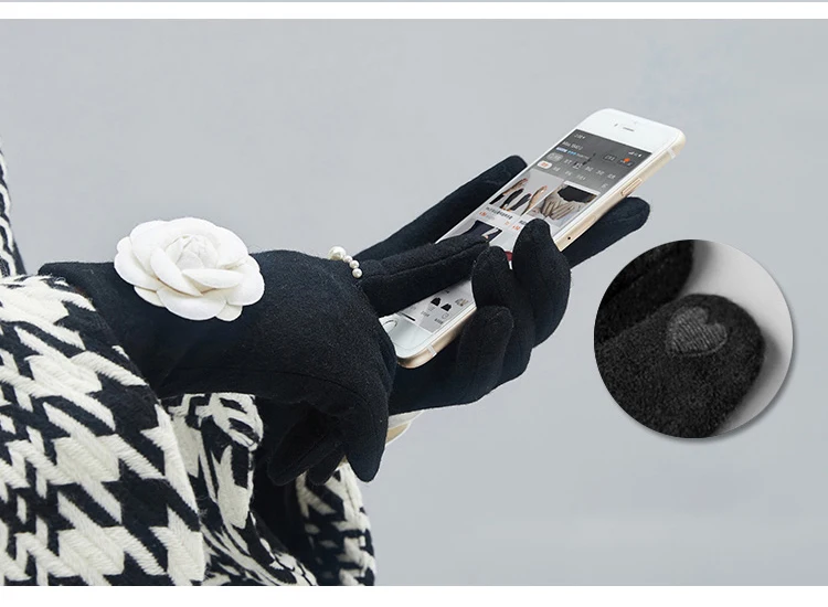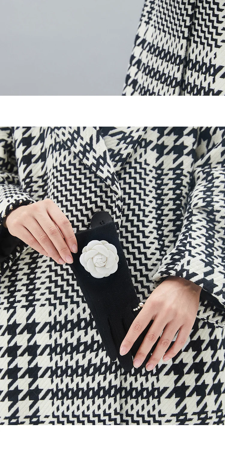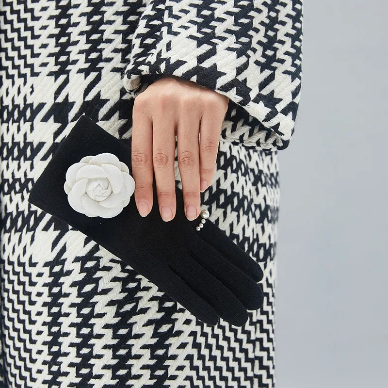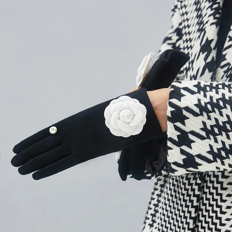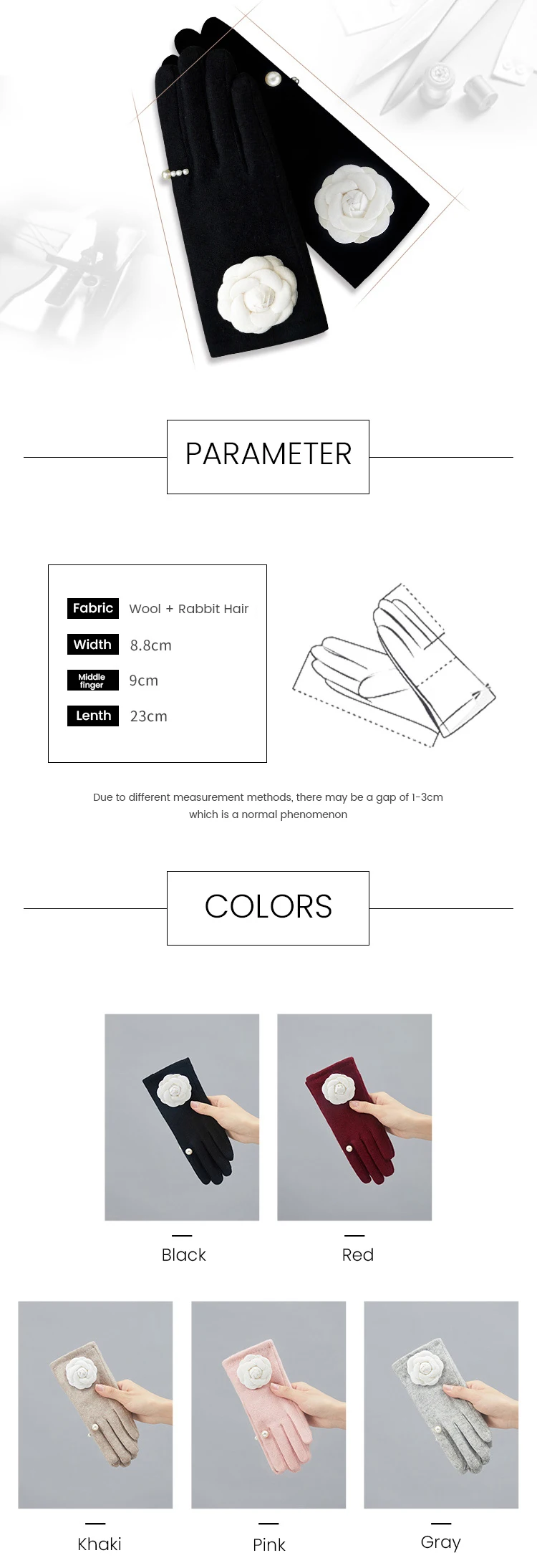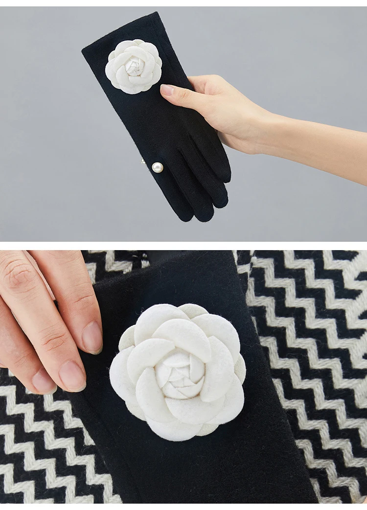 Зимние перчатки для женщин, варежки с подкладкой из камелии и бархата, шерстяные теплые перчатки для сенсорного экрана, декоративные варежки с цветами для вождения