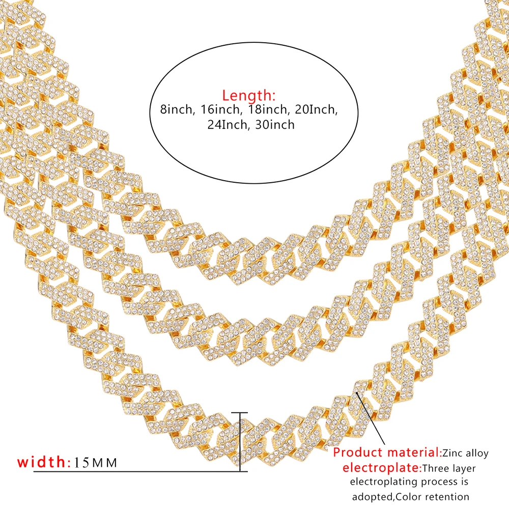 Цепь кубинская в стиле хип-хоп для мужчин и женщин, сверкающее ожерелье из кубинской цепи с закрепкой из циркония, 15 мм, 2 ряда, AAA