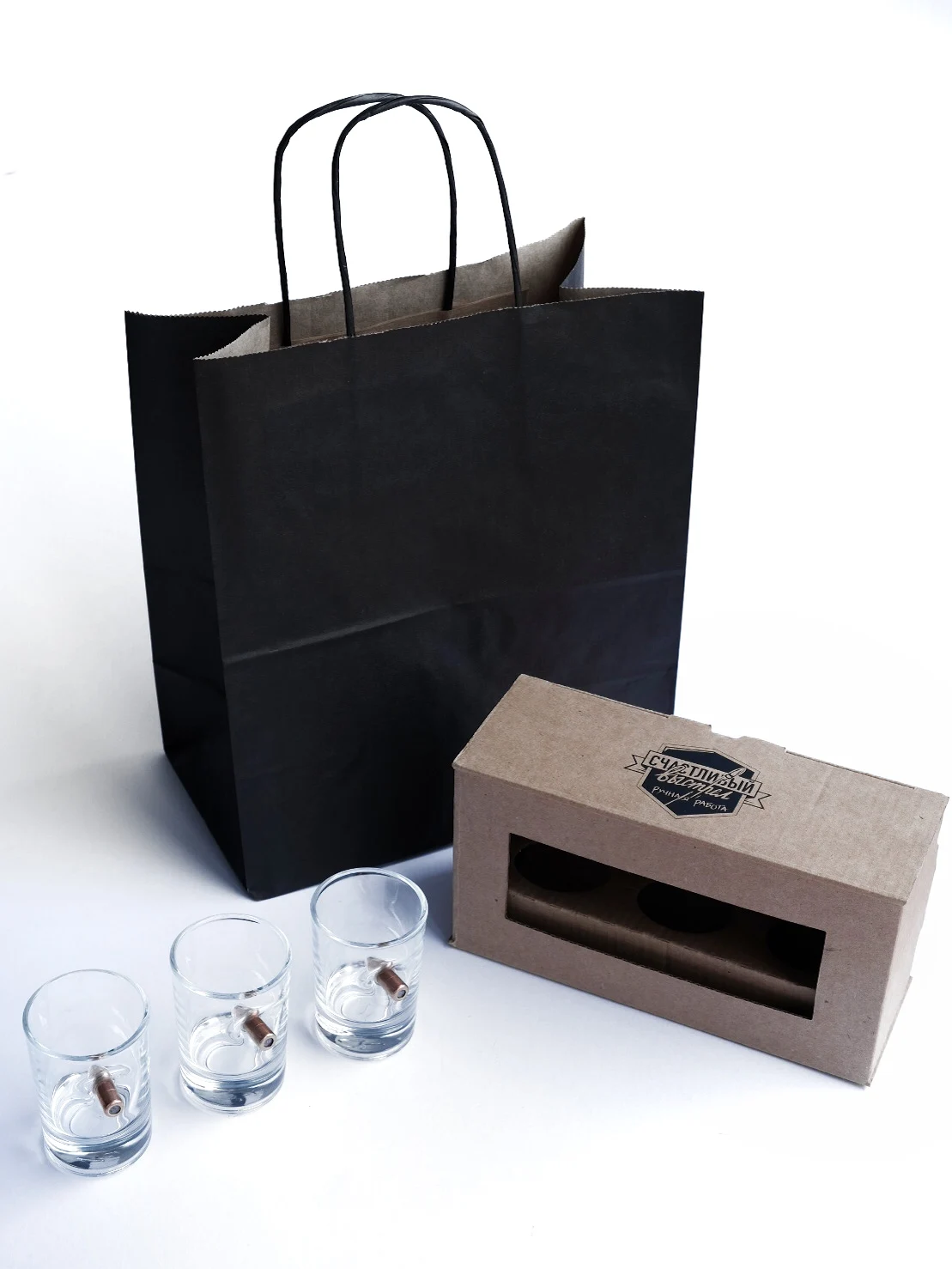 Набор рюмок 3х40мл СЧАСТЛИВЫЙ ВЫСТРЕЛ с настоящей пулей 7,62 Подарок мужчине пуля в стакане