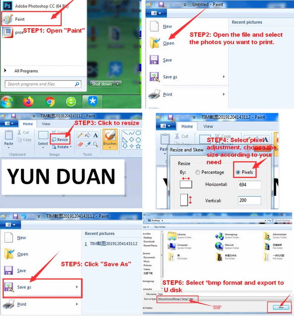 Действия по импорту изображений в струйный принтер с помощью u-диска:ПРИМЕЧАНИЯ по импорту изображений на принтер:① Максимальная единица вертикальных пикселей изображения рекомендуется 142.② Тип сохранения изображения: монохромное Растровое изображение (BMP).③ Создайте новую папка на u-образном диске и укажите ее «TXT», и поместите фотографии, которые будут напечатаны в эту TXT-папка.