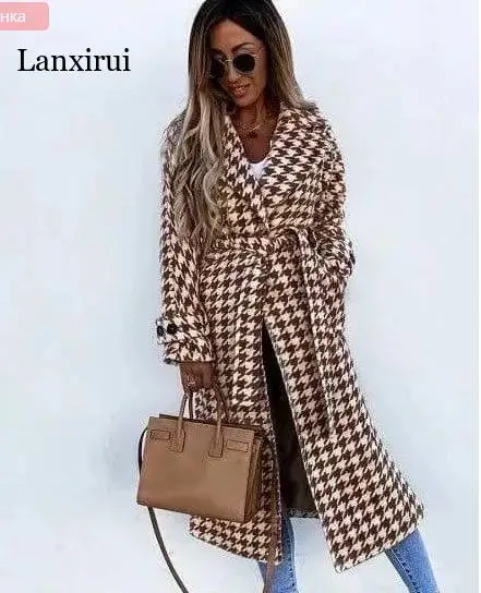 Женское шерстяное пальто, женское длинное дамское пальто с рисунком гусиные лапки, большого размера, осенне-зимняя утепленная Свободная куртка с лацканами