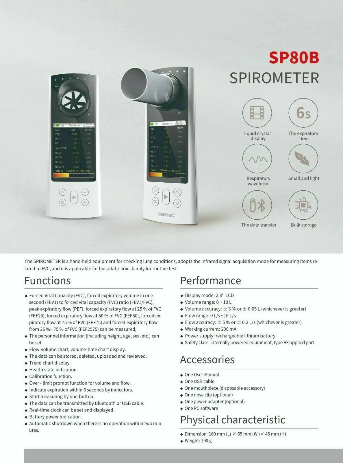 Цифровой Bluetooth спирометр CONTEC SP80B, диагностический виталограф, Спирометрия + программное обеспечение для ПК