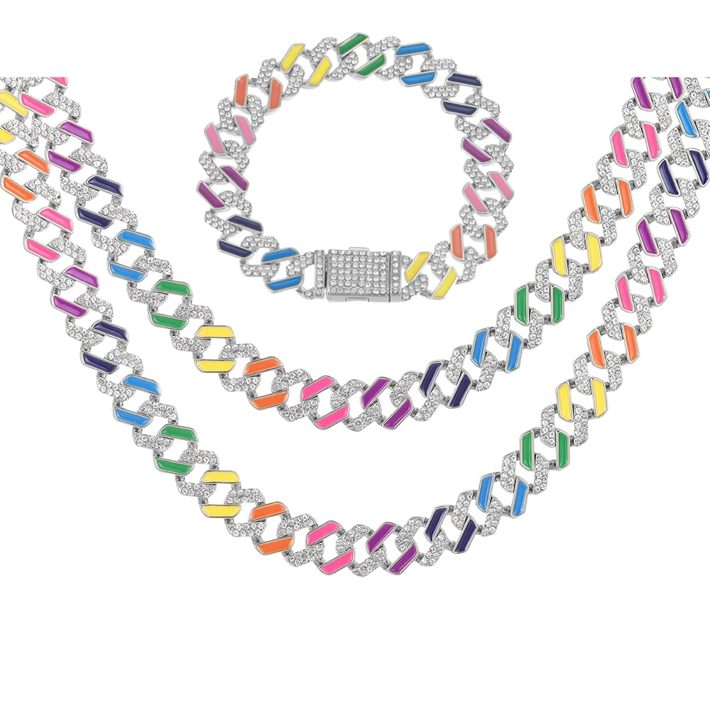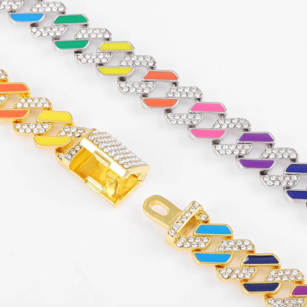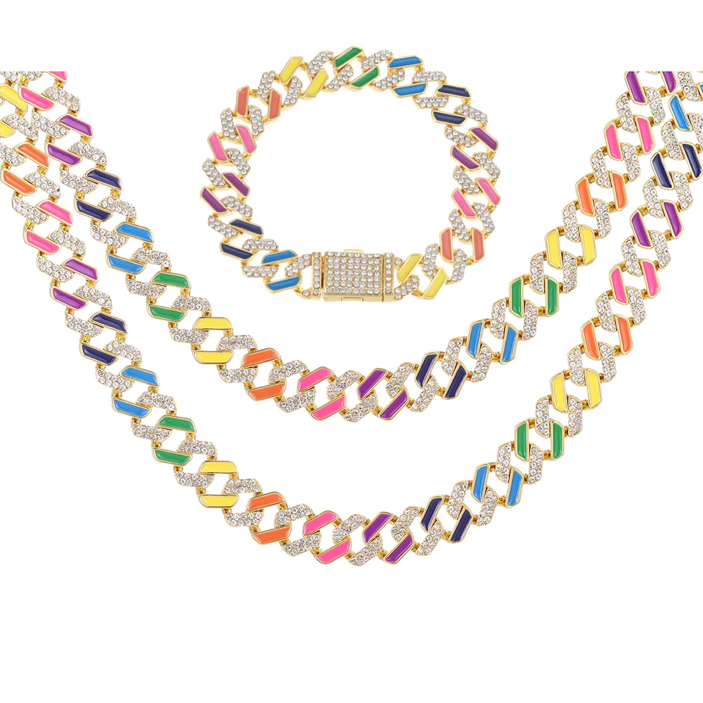 Льдом хип-хоп, КУБИНСКИЙ звено цепи ожерелье для мужчин и женщин с украшением в виде кристаллов разноцветные неоновые эмаль Колье-чокер Радуга браслет, ювелирные изделия в качестве подарка