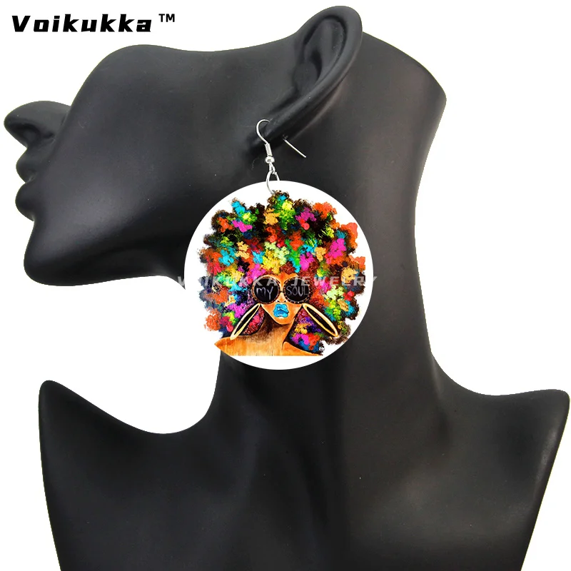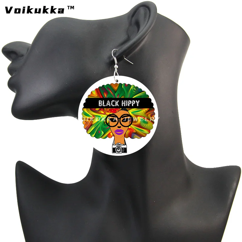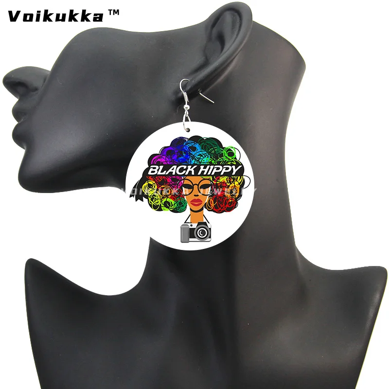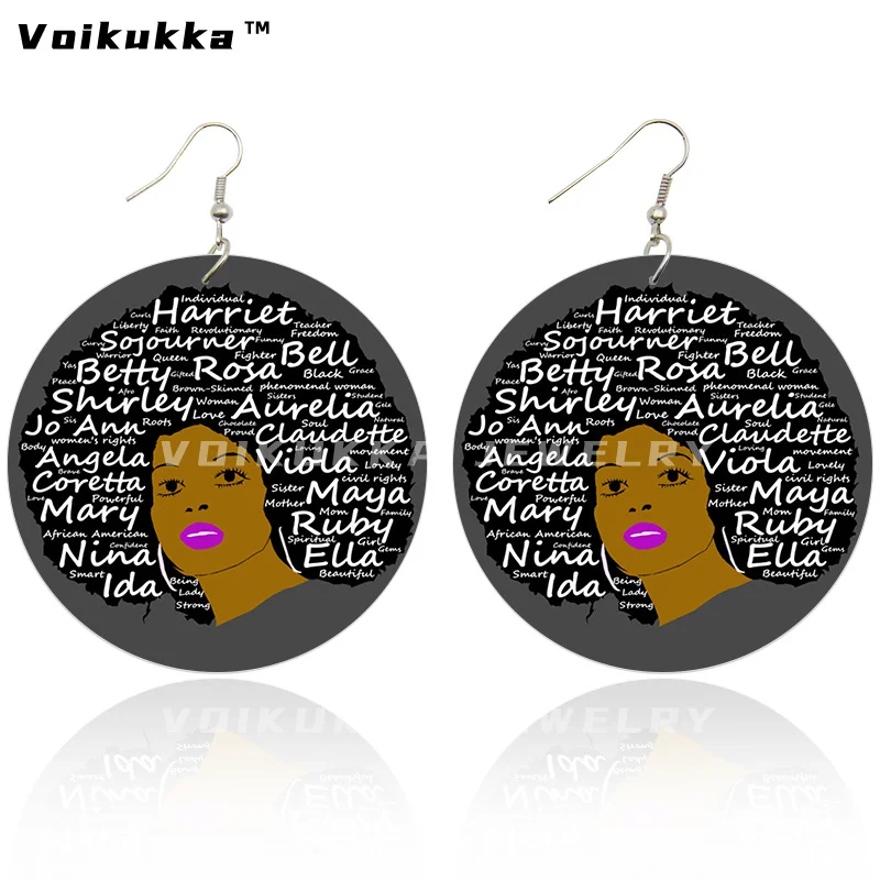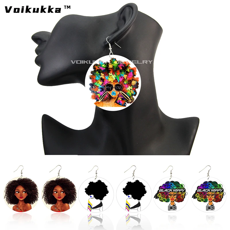 Voikukka ювелирные изделия 6 см круглые Висячие женские африканские серьги меланин был поппин Черный счастливый Woden с обеих сторон печать