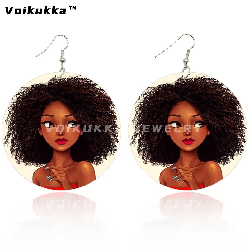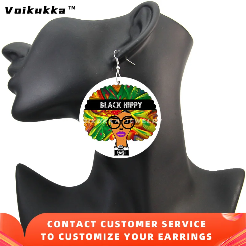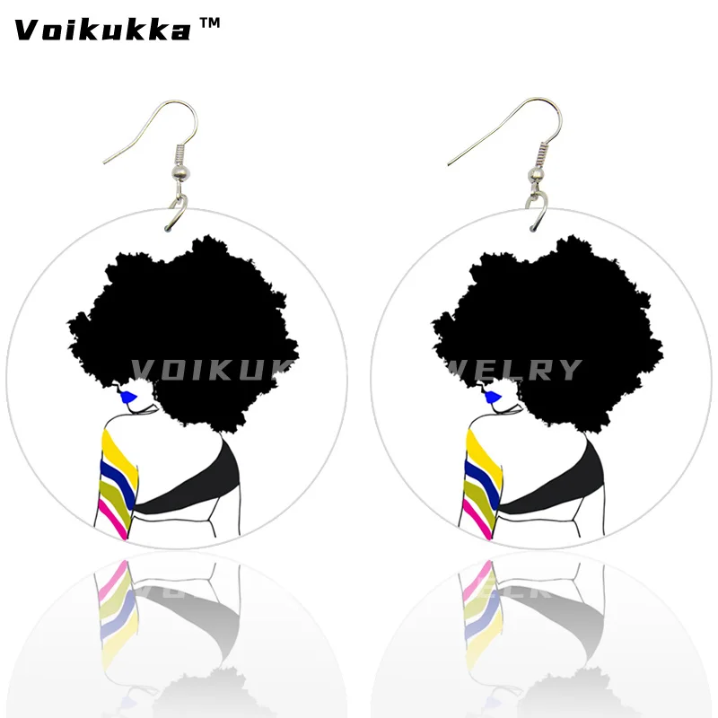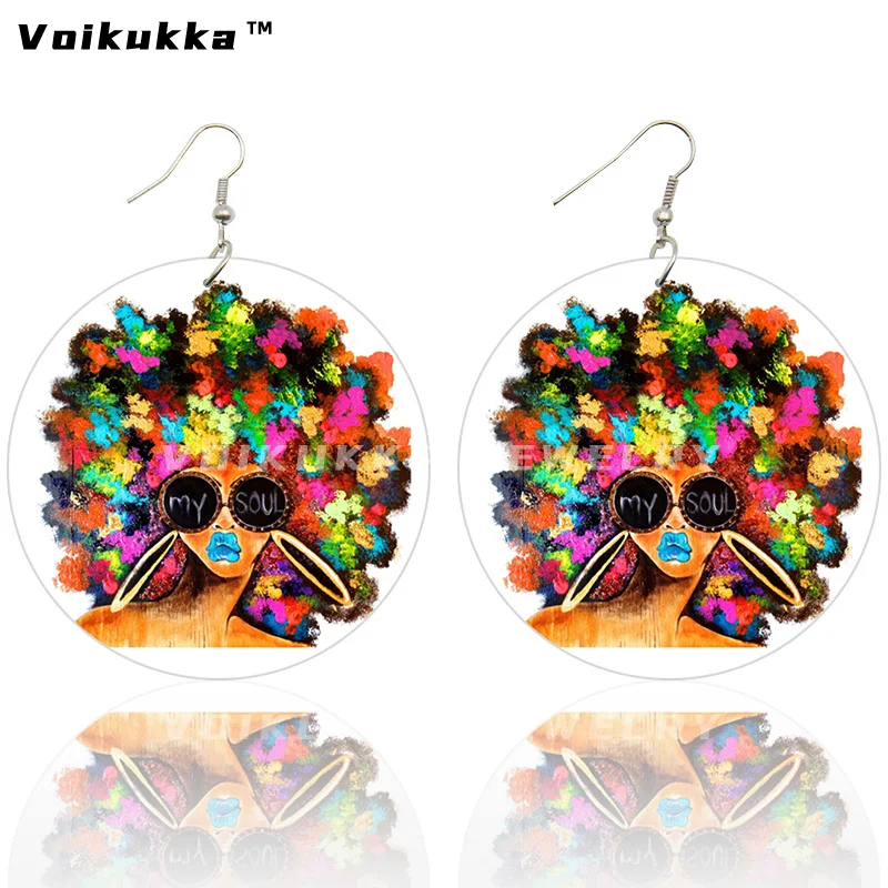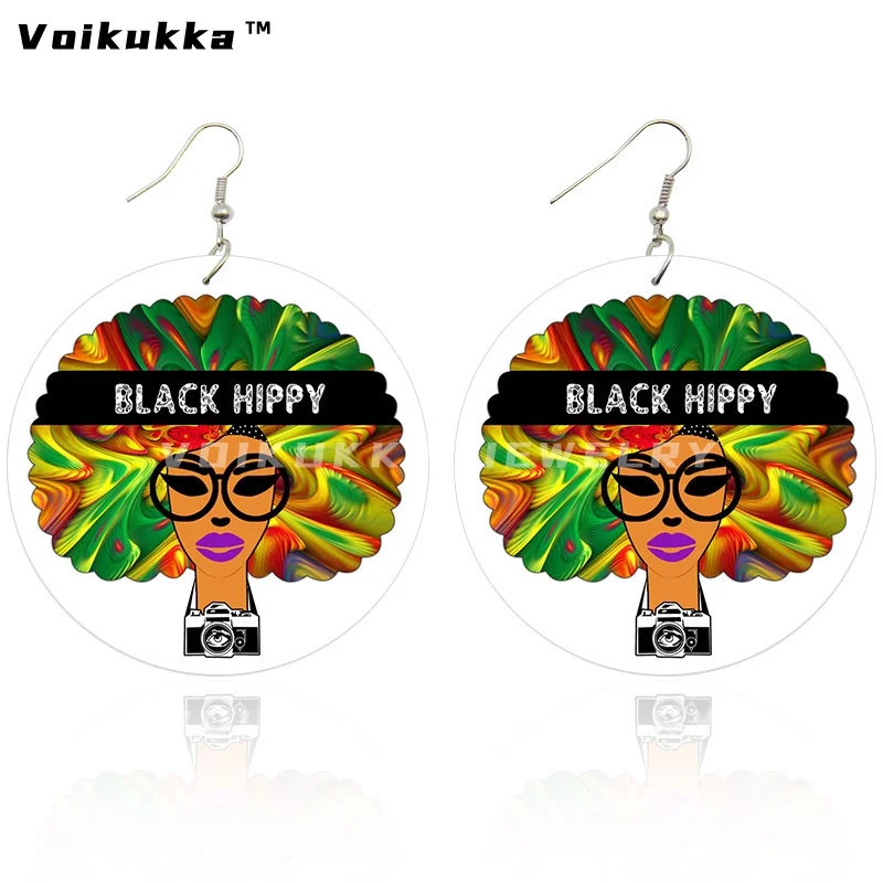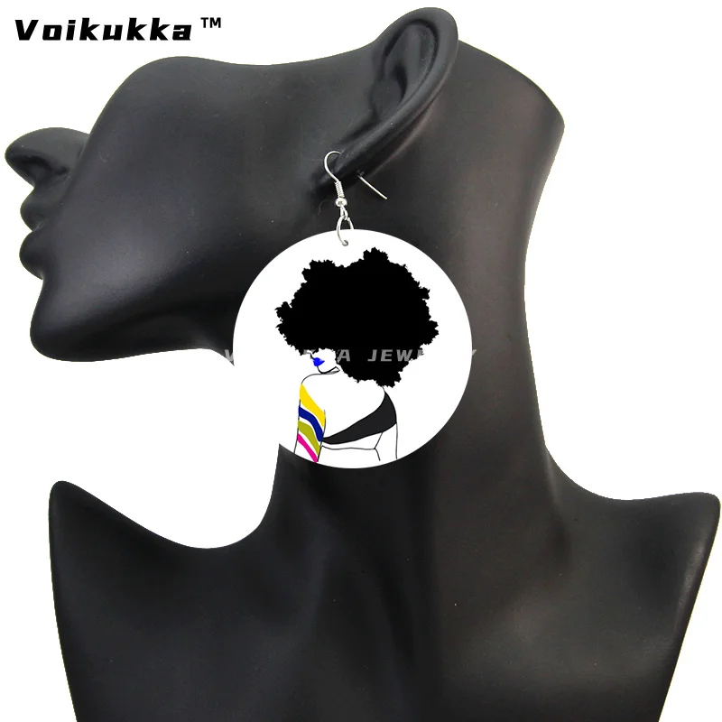 Voikukka ювелирные изделия 6 см круглые Висячие женские африканские серьги меланин был поппин Черный счастливый Woden с обеих сторон печать