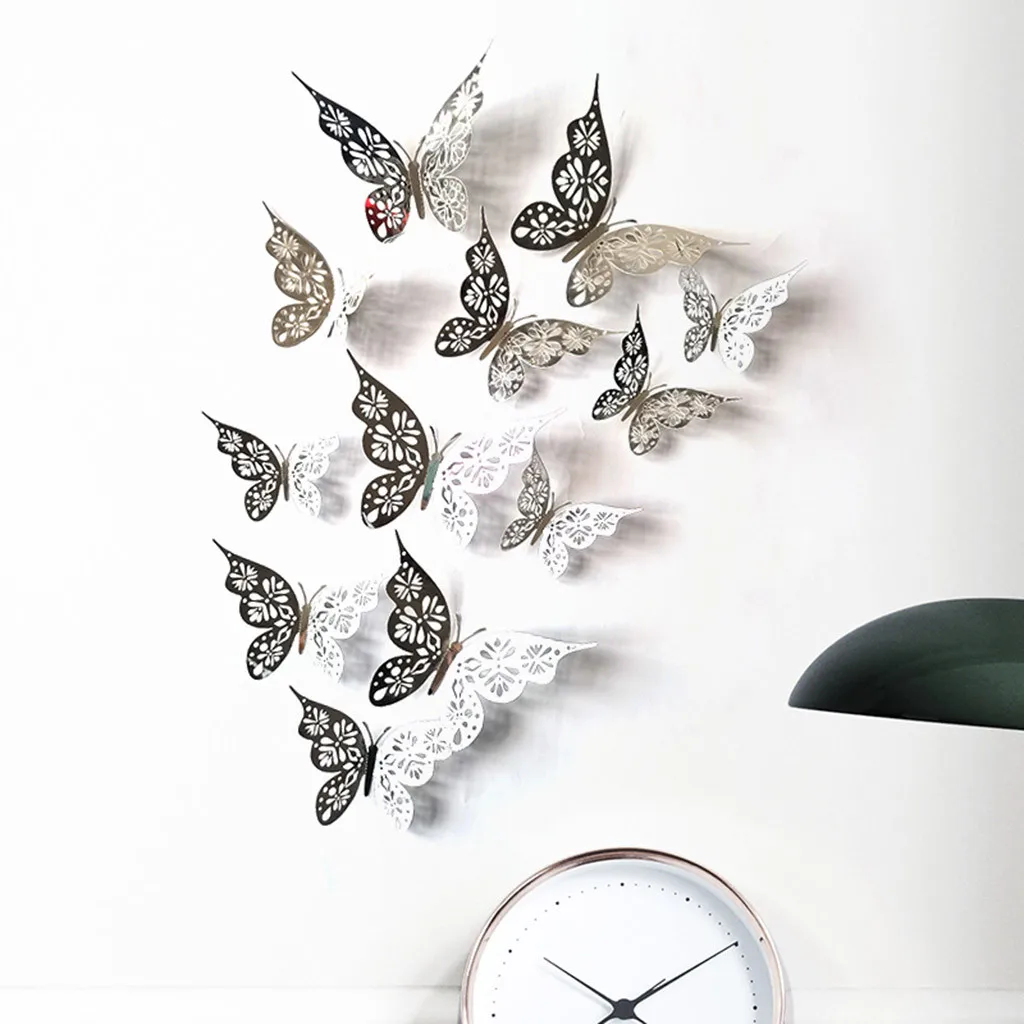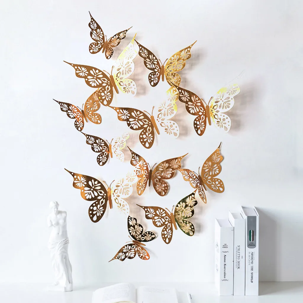 12 шт. 3D наклейки на стену полые розовые Золотыесеребряные бабочки...