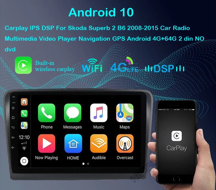 Автомобильная Мультимедийная система Carplay, автомагнитола под управлением Android 10 для Skoda Superb 2 B6, с видеоплеером, GPS-Навигатором, без dvd, типоразмер 2 din, 2008-2015