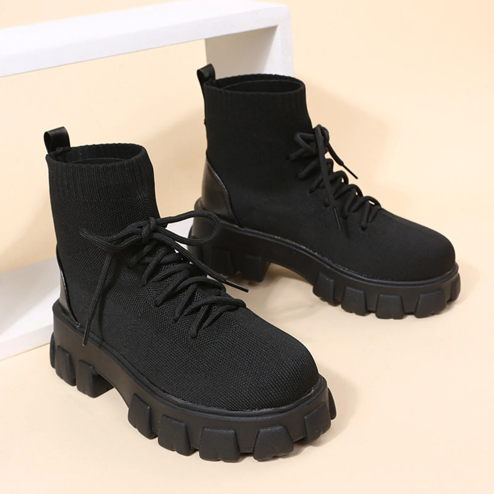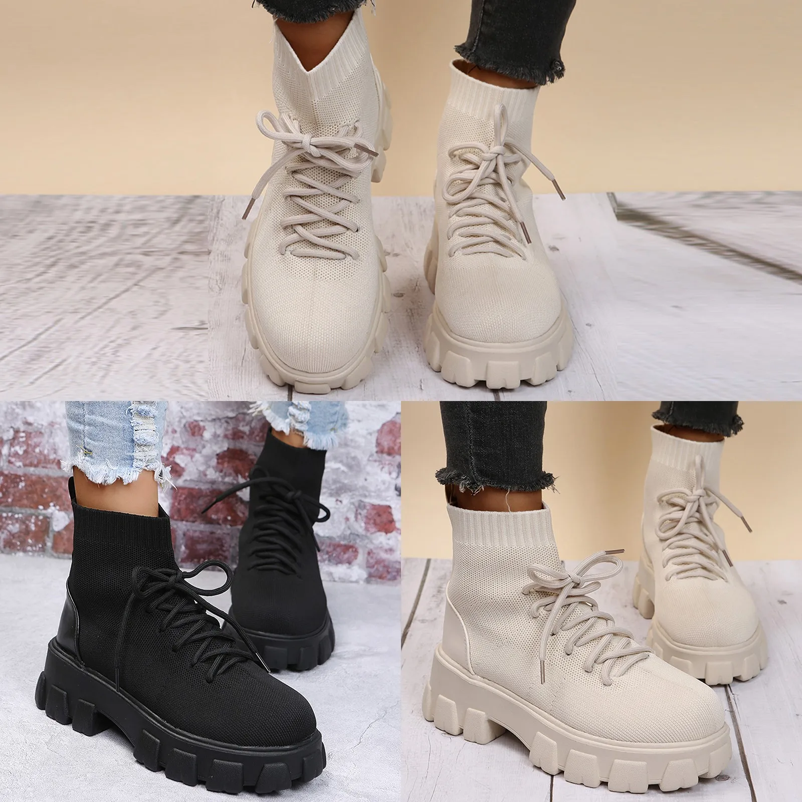 Новые Вязаные ботинки-носки на шнуровке с квадратным каблуком черные женские ботильоны на платформе 2021 Модные женские зимние теплые ботинки на толстой подошве
