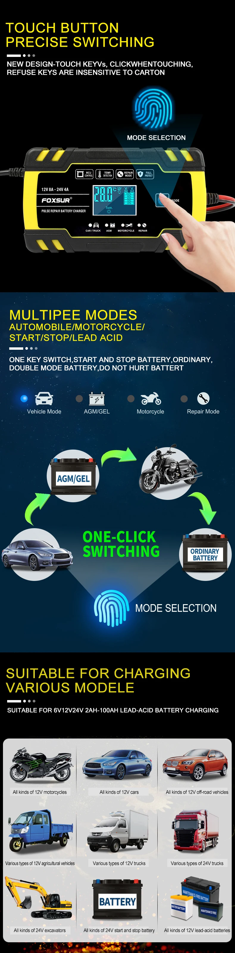 Зарядное устройство FOXSUR 12V24V 8A для автомобильных аккумуляторов, ЖК-дисплей для AGM GEL WET, свинцово-кислотные аккумуляторы для мотоциклов, автоматическое зарядное устройство для импульсного ремонта