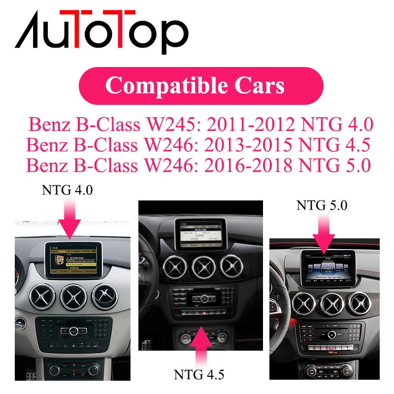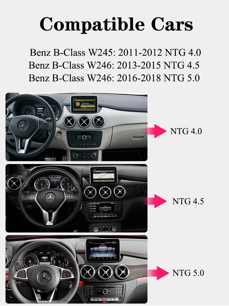 Benz B-Class W245: 2011-2012 (оригинальный автомобиль с NTG 4,0)Benz B-Class W246: 2013-2015 (оригинальный автомобиль с NTG 4,5)Benz B-Class W246: 2016-2018 (оригинальный автомобиль с NTG 5,0)