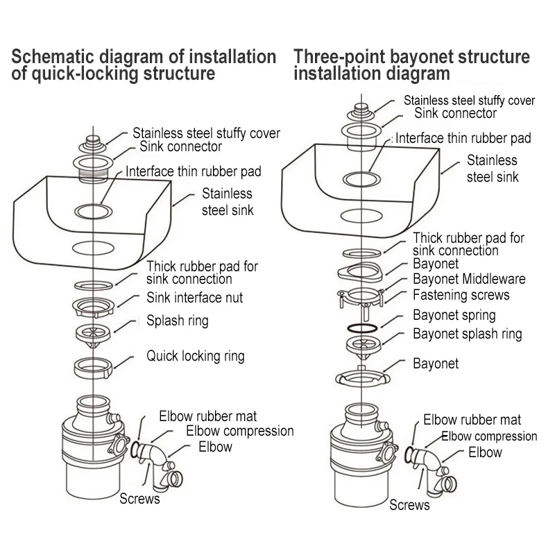 Роль утилизации пищевых отходов:Уменьшить запах на кухне, особенно в шкафах, где хранятся мусорные баки, и избежать возможности размножения бактерий, так что Чистка и выгрузка домашнего мусора становится легкой и чистой работой.Параметр:Напряжение: 110 В/220 ВЧастота: 50/60 ГцМощность: 370 ВтСкорость: 2600 об/минОсобенности:1) Управление воздушным потоком с помощью переключателя2) может быть коническая шайба для посуды3) Защита от перегрузки4) звукоизоляция5) шлифовальные элементы из нержавеющей стали6) канализационная Соединительная труба: Длина 71 см, короткая 33,5 см, диаметр отверстия 4 смИнструкции:1) Включите кран холодной воды2) Включите устройство для удаления пищевых отходов3) Налейте пищевые отходы в раковину (не заливайте раздражающие химические вещества или горячее масло)4) Управляйте отходами пищевых продуктов, пока вы не услышите только звук двигателя и поток воды5) Выключите мусорный процессор после шлифования6) выключите воду примерно через 15 секунд после шлифования.
