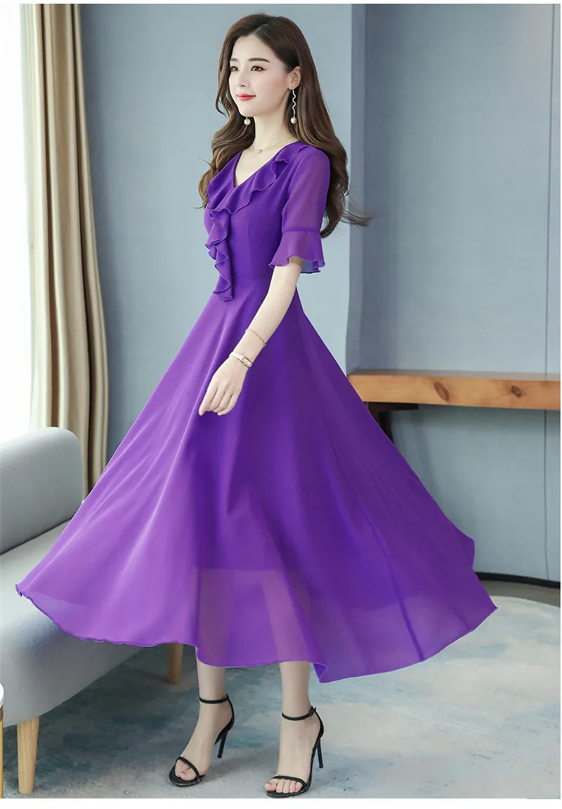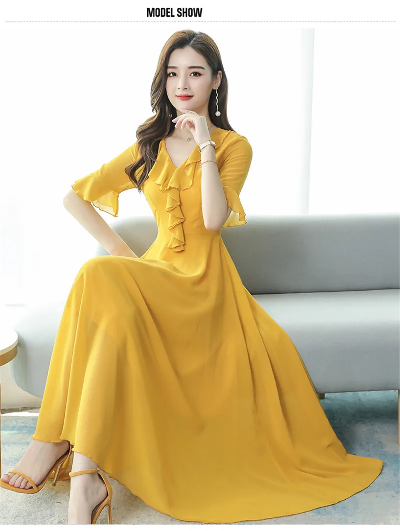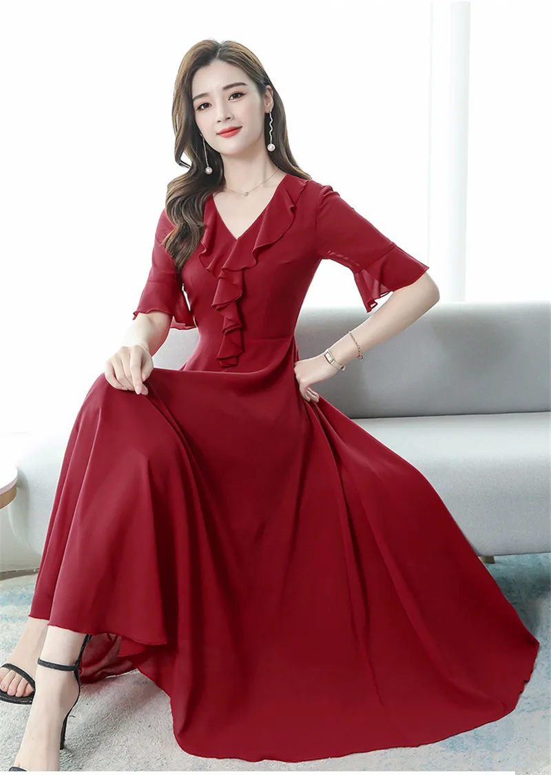 Шифоновое платье, корейское летнее новое модное платье с V-образным вырезом и расклешенными рукавами, тонкое темпераментное платье с широкой юбкой, брелок для кольца