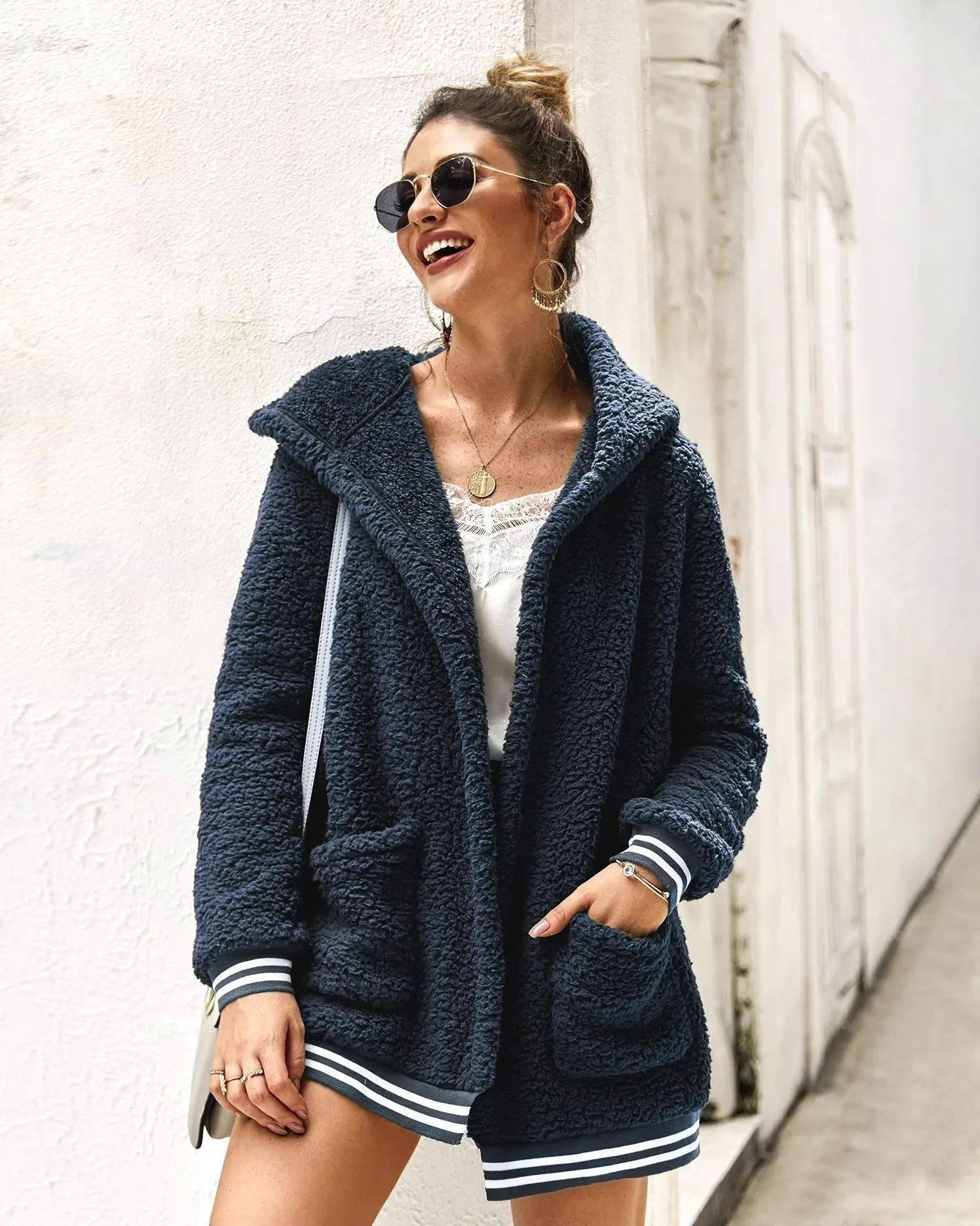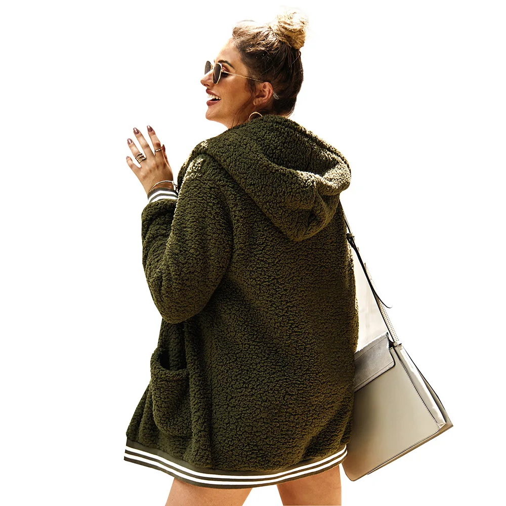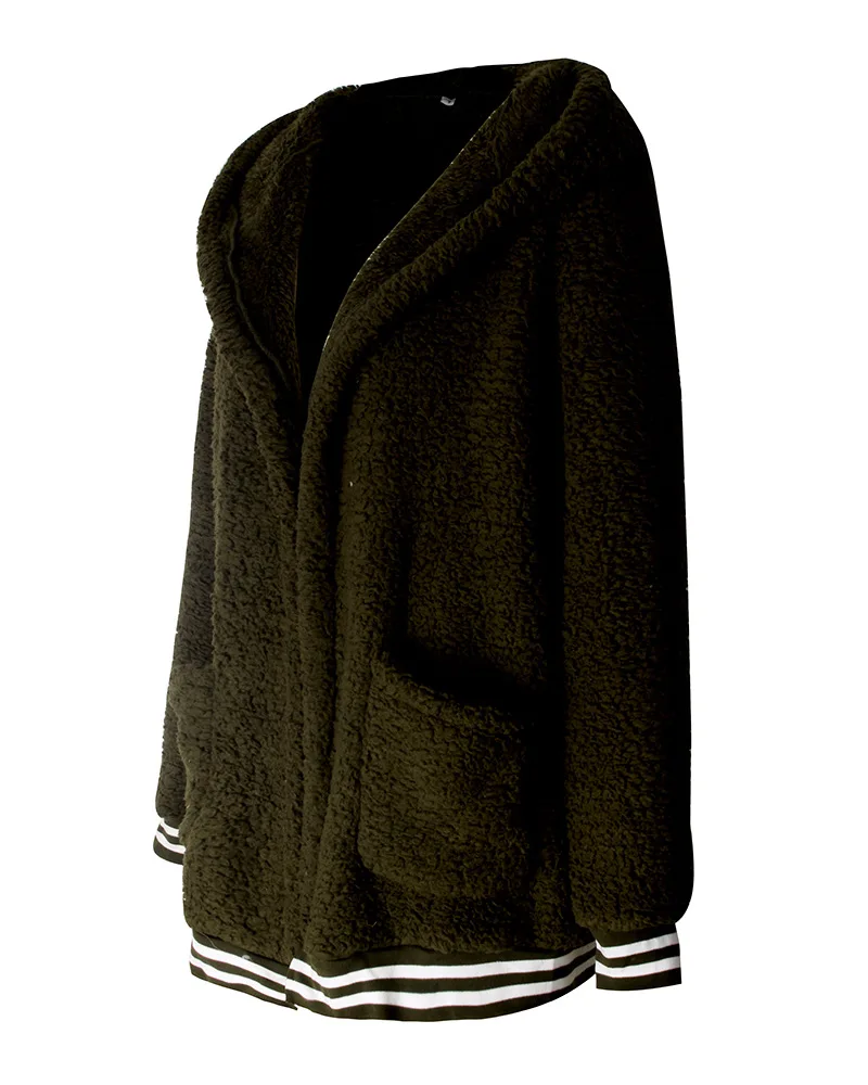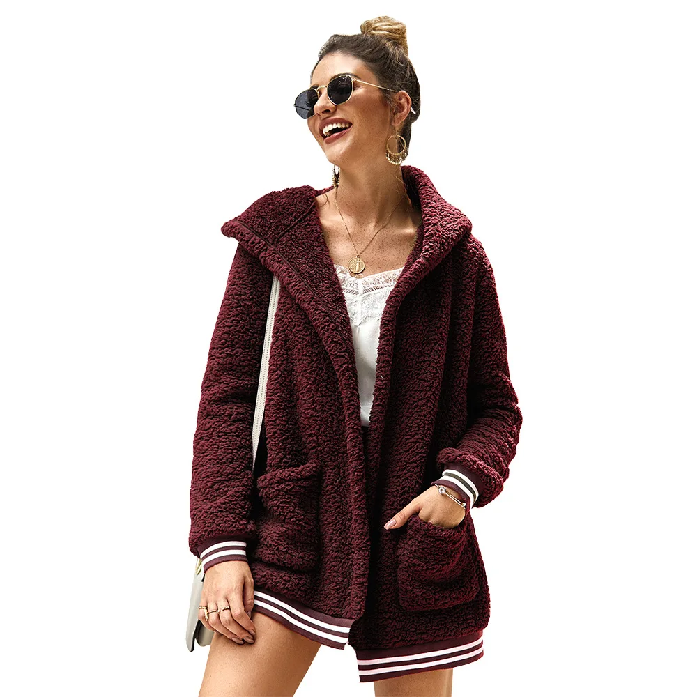 Осень 2021, шерстяное пальто с шапкой, длинная куртка в полоску, плотный теплый кардиган из смесовой ткани с карманами, плюшевое флисовое пушистое пальто, верхняя одежда