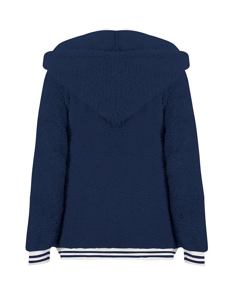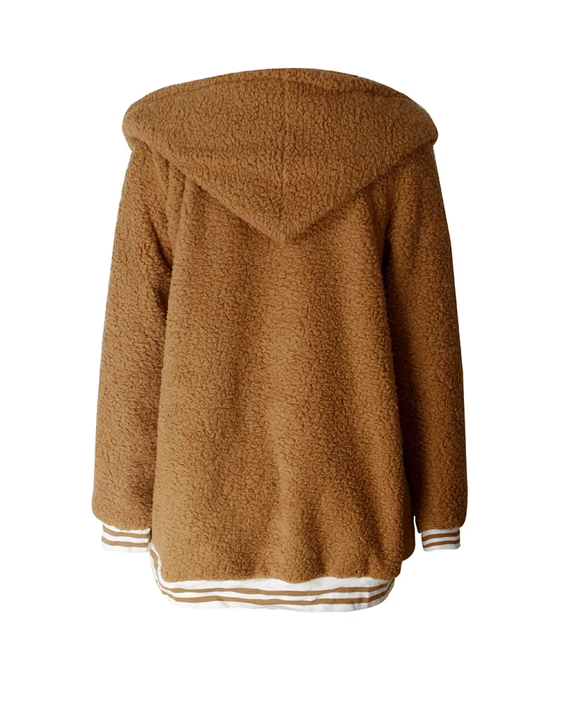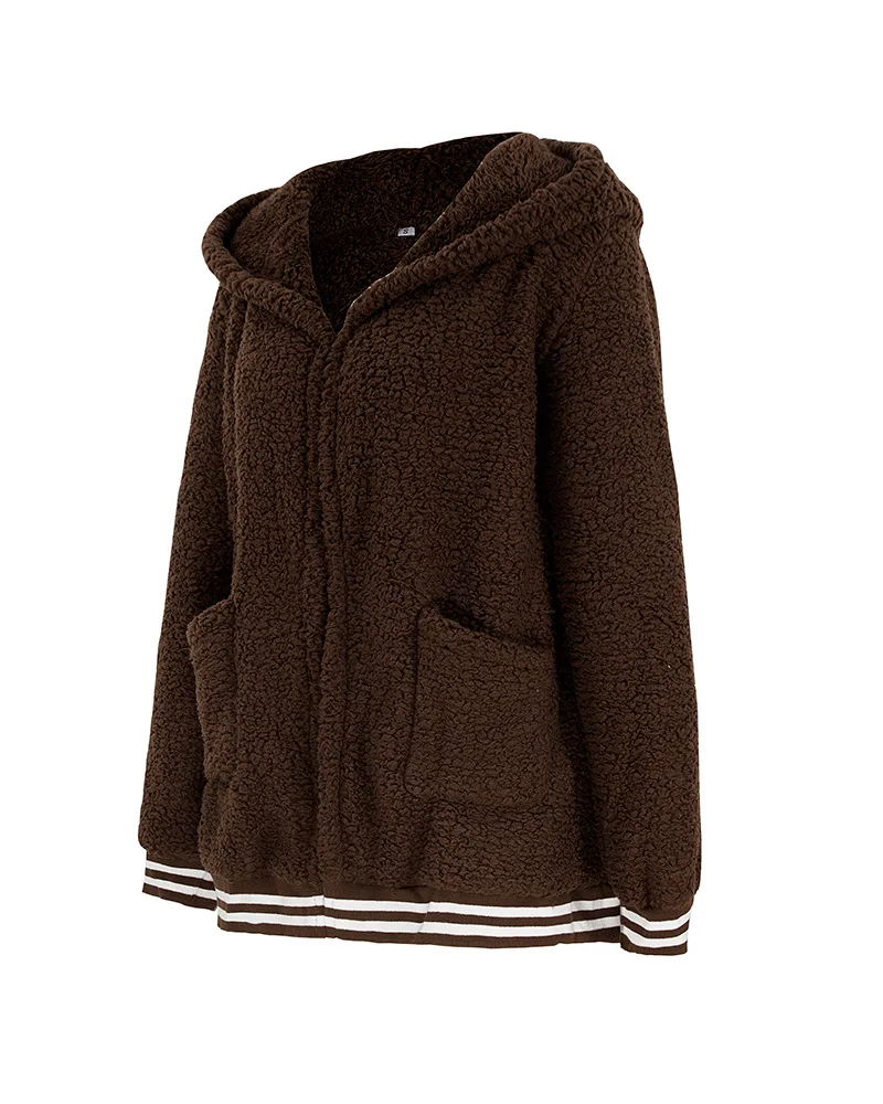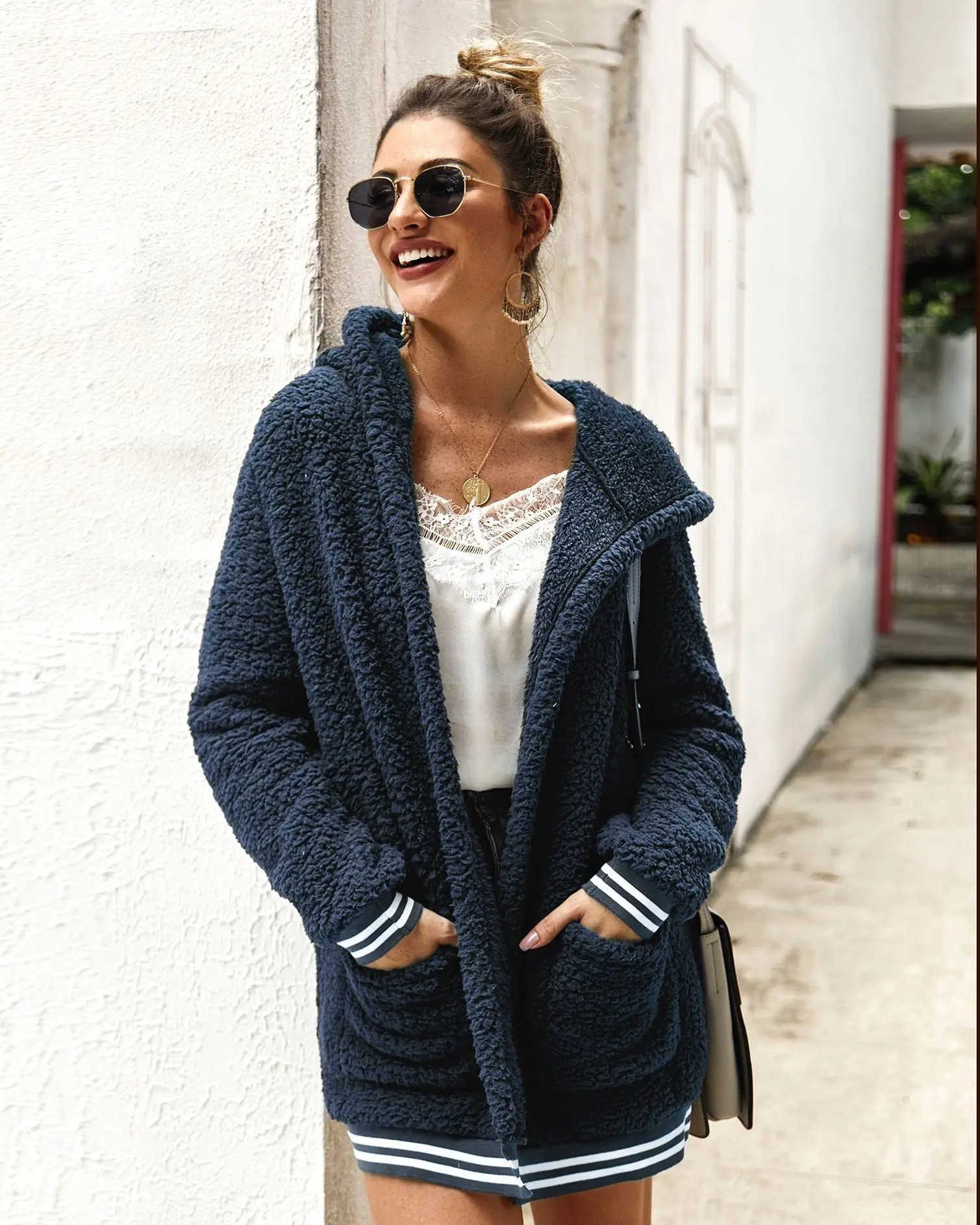 Осень 2021, шерстяное пальто с шапкой, длинная куртка в полоску, плотный теплый кардиган из смесовой ткани с карманами, плюшевое флисовое пушистое пальто, верхняя одежда