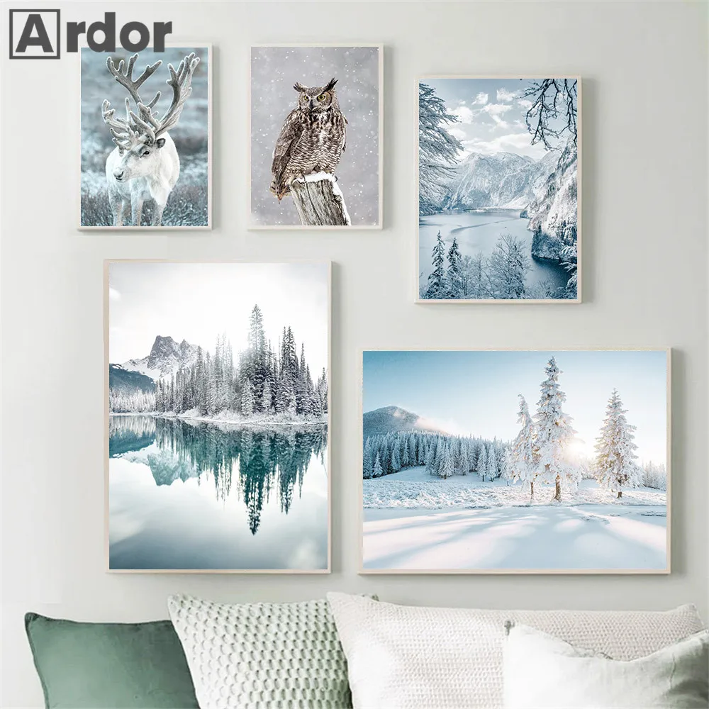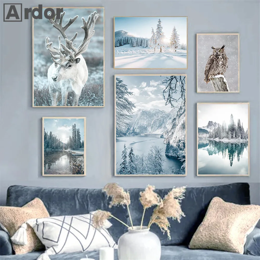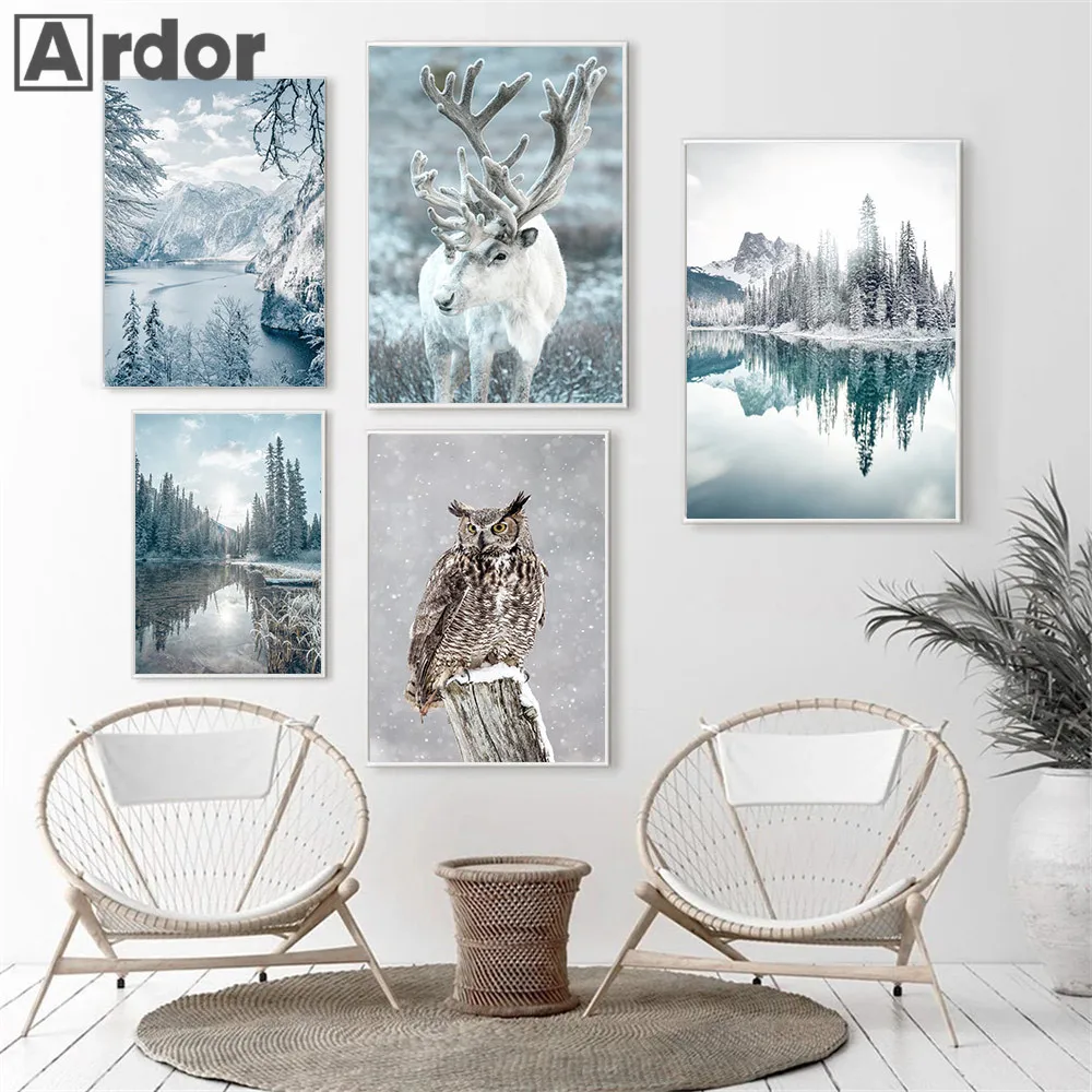 Холст с изображением совы, оленя, снега, гор, зимнее озеро, пейзаж, постер, настенные картины, украшение для гостиной и дома
