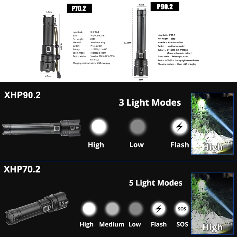Особенности: 1. Светильник: XHP70.2/XHP90.22,5-режимы: 100% -70% -50%-вспышка-SOS(XHP70.2)/100% -70%-вспышка (XHP90.2).3. Срок службы: 100000 часов4. Цвет Фонарика: черный5. Излучаемый Цвет: белый светильник6. Переключатель: нажмите переключатель7. Чехол Материал: Прочный алюминий авиационного класса8. Расстояние освещения: 200-500 метров9: светодиодный срок службы: более 100000 часов10. Батарея: 26650/1865011. Зум: механический зум12. Водонепроницаемость: IPX6