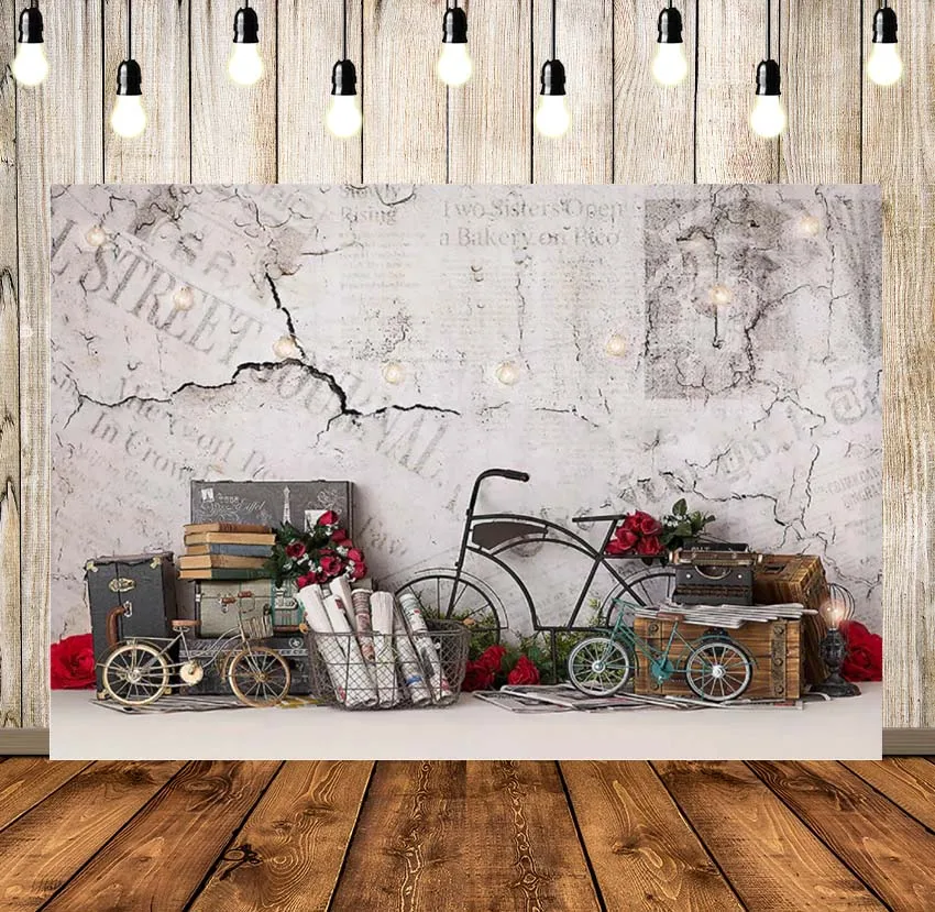 Фон для фотосъемки с изображением белой кирпичной стены на День святого Валентина, велосипеда, красной розы