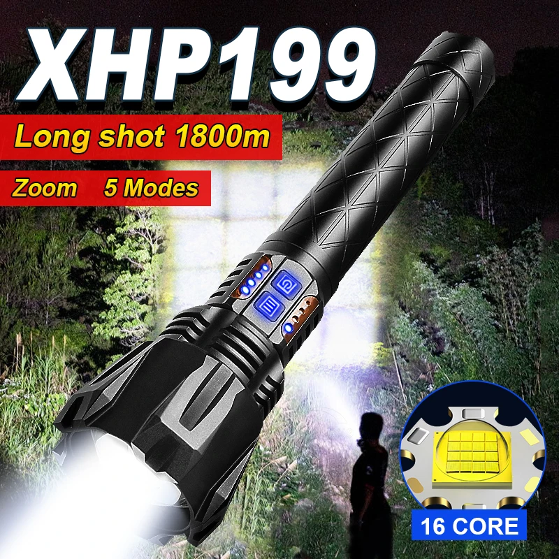 Характеристики продукта XHP199❃Brand: PAWEINUOModel модель светодиодной лампы: 16 ядер XHP199❃Метод зарядки: быстрая зарядка Type-CLighting Расстояние освещения: 1800 м❃Материал: авиационный алюминиевый сплав❃Объектив: оптическая выпуклая линза❃Body Цвет: черныйСветильник светильник индикатора: дисплей батареи справа, яркость (положение шестерни) дисплей слева5 5 режимов: клавиша переключения: слабые-Средние-сильные функциональные клавиши: супер яркие-стробоскопический мигание любой передачи Длительное нажатие для выключенияType тип батареи: 18650 или 26650Lighting Время освещения: аккумулятор 18650 4-8 часов; Аккумулятор 26650: 8-15 часовZoom Режим масштабирования: телефото зум❃Waterproof Рейтинг: IPX6
