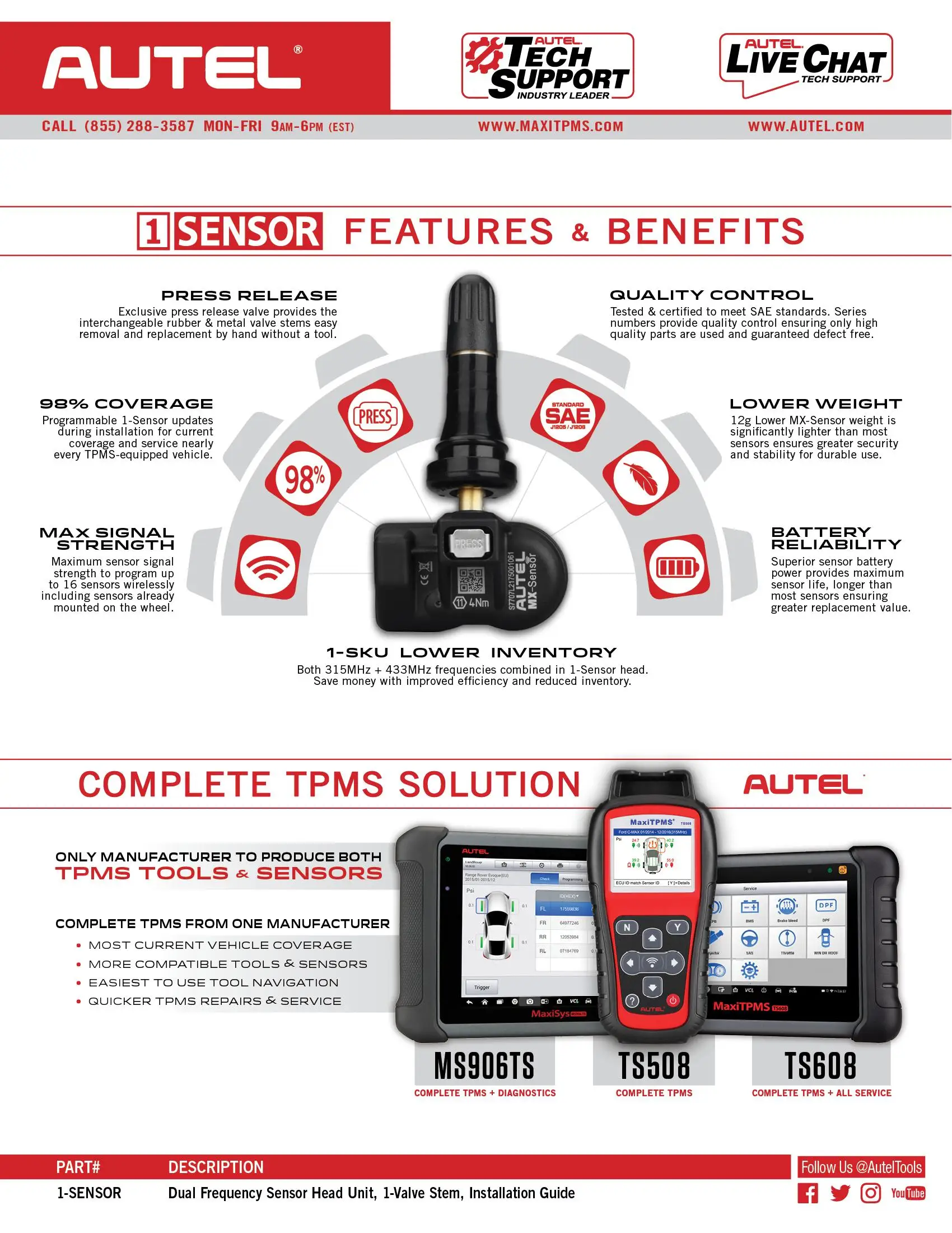 1. 315 МГц и 433 МГц 2в1Этот датчик контроля давления в шинах (для TPMS) был изготовлен, чтобы объединить приложения 315 МГц и 433 МГц в одном датчике, чтобы значительно упростить управление запасами пользователей и снизить инвестиции, а также потери продаж. И он создан для выполнения как OE датчиков с точки зрения сигнала, долговечности и функциональности.2. Максимальная сила сигнала беспроводного программированияИсключительная сила сигнала датчика позволяет AUTEL 1-sensor быть легко запрограммирован без проводов даже когда датчик s уже установлен на колесо. И с сильной силой сигнала, в настоящее время до 16 датчиков могут быть запрограммированы в одном сеансе с новейшими TPMS инструментами Autel.3. Эксклюзивный пресс-релиз взаимозаменяемых клапановЗапатентованная конструкция клапана для прессования позволяет легко заменить Сменные резиновые и металлические клапаны в одной и той же головке датчика вручную, без необходимого инструмента для установки клапана. Просто нажмите и нажмите. Установка датчиков TPMS никогда не была такой простой.4. Улучшенная надежность батареи нижний датчикС высококачественными материалами и передовой технологией TPMS, AUTEL 1-Sensor обеспечивает превосходный Срок службы батареи и надежность, чтобы соответствовать производительности батареи OE sensor. Корпус с 1 датчиком весит всего 13 г, что делает его значительно легче, чем большинство сенсоров на рынке, что обеспечивает лучшую стабильность и производительность датчика.5.98% покрытие транспортного средстваПростой в использовании и экономически выгодная необходимость для любого магазина, осуществляющего ремонт TPMS, датчик Autel 1-SKU имеет долгую возможность покрыть более 98% всех OE датчиков на рынке, чтобы поддерживать до 90% Северной Америки, европейские и азиатские бренды. На уровне магазина требуется только 1 датчик, чтобы обслуживать почти каждый ТРМ оборудованный автомобиль означает более низкую стоимость ремонта и более высокую эффективность установки6. Строгий контроль качестваAutel гарантирует, что mx-датчик не имеет дефектов производства в течение 24 месяцев или 24000 миль, в зависимости от того, какой вариант будет первым. Каждый mx-датчик Autel имеет ряд номеров для обеспечения контроля качества. Номер серии отпечатан на датчике или может быть прочтен с помощью инструментов Autel TPMS. С номером серии, Autel может отслеживать качество датчика от нашего производства фабрики для обеспечения только самого высокого качества частей установлены.