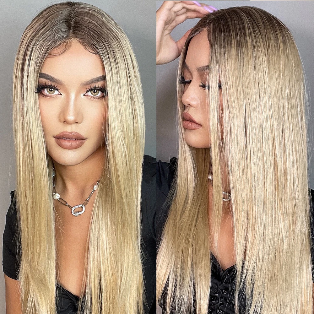 Длинные шелковистые прямые синтетические парики ALAN EATON на шнуровке спереди, натуральные парики средней длины с эффектом омбре, коричневые блонд, парики для женщин, косплей, ежедневное использование