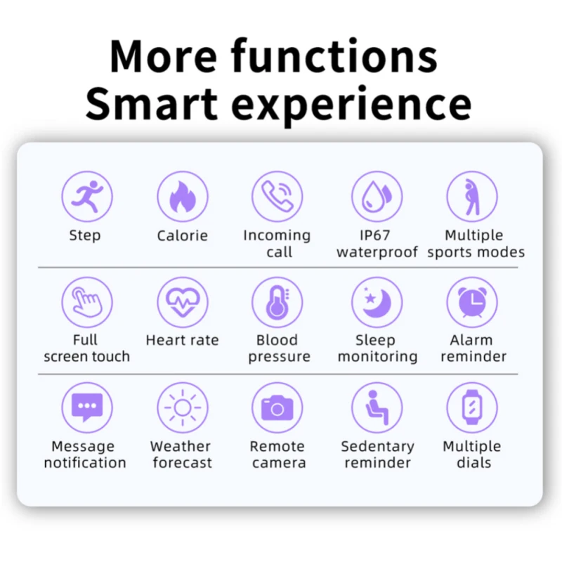 Напоминание о наличии функции включения переключателей на стороне приложения (входящие звонки, текстовые сообщения, Wechat, QQ, Facebook, Twitter, LinkedIn, WhatsApp, Line, Instagram, Snapchat, skype и другие мобильные приложения) и события, такие как сидение, будильник, питьевая вода, принятие лекарств, И т. д. Напоминание информации, будильник, фото, поднятый экран запястья, напоминание о сидячем положении, секундомер, обратный отсчет, поиск мобильный телефон, регулировка яркости браслета, регулировка продолжительности экрана браслета, подсчет шагов, поддержка приложения для синхронизации данных сердечного ритма, упражнений, пробега, калорий, шагов, сна, полного сна, глубокого, Светильник, запись истории, пульс, кровяное давление, сон, упражнения