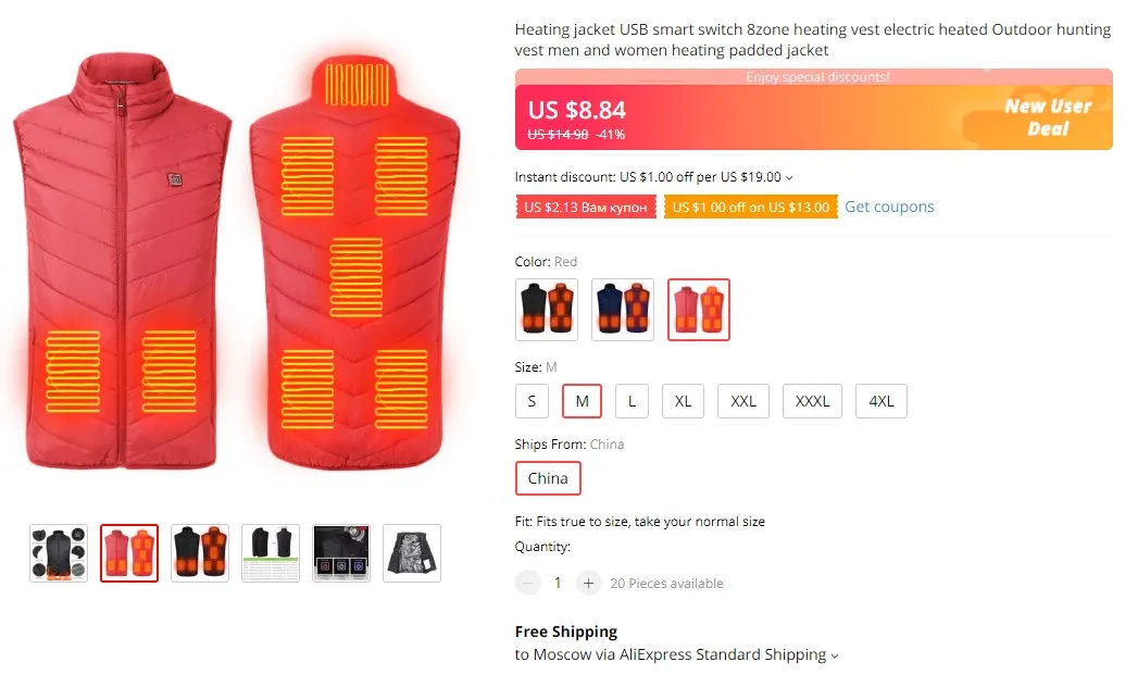 * 5. Одноминутный быстрый нагрев при подключении к источнику питания 5 В/2 А (рекомендуется), низкое энергопотребление позволяет жилету работать 8 часов при 45 °C непрерывно при подключении к аккумулятору мощностью 10000 мАч (не входит в комплект)