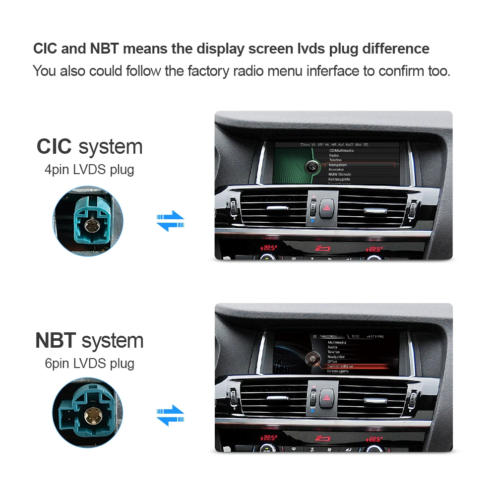 > Примечание: CIC и NBT только что имеют экран lvds разница в вилке, остальное то же самое.> Следуйте за автомобилем год или оригинальный завод Главный блок экрана меню, чтобы выбрать правильный.> CIC означает, что разъем LVDS на дисплее 4pin> NBT означает, что разъем LVDS дисплея составляет 6pin> BMW X3 F25 X4 F26 2011-2013 (4 контактный LVDS CIC Системы)> BMW X3 F25 X4 F26 2014-2016 (6 контактный LVDS НБТ Системы)Год для автомобиля только для справки, лучше проверить разъем lvds, чтобы убедиться.
