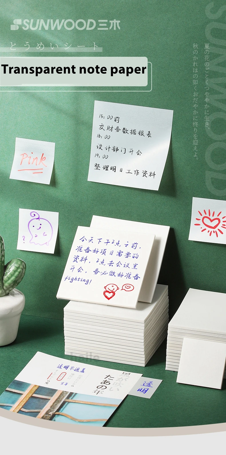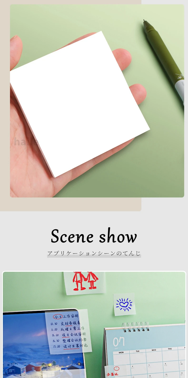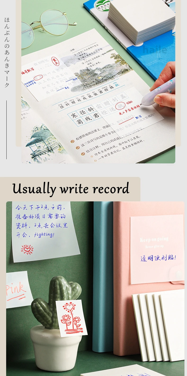 1. Высококачественный набор прозрачных липких нот, водонепроницаемый, сильная липкая способность, удаляет чисто. (50 листов на подкладку)