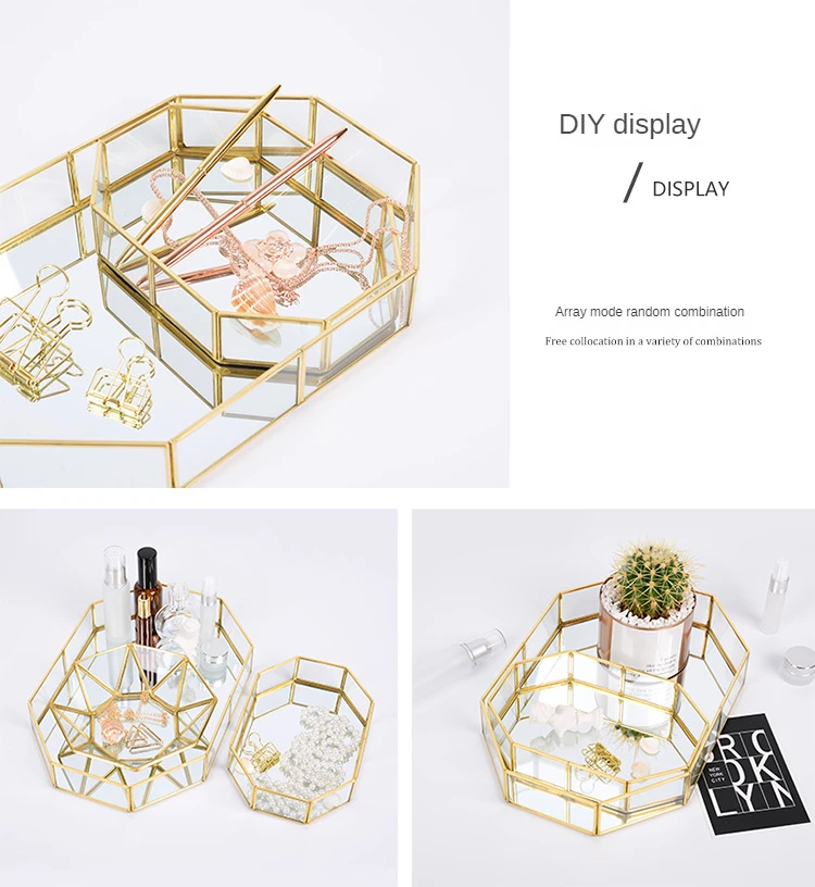 Латунный лоток для хранения, золотистая многоугольная стеклянная та...