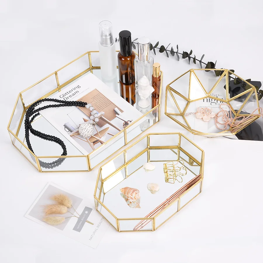 Поднос для хранения косметических украшений, туалетный столик, настольный поднос для хранения из золотистого стекла, геометрические украшения