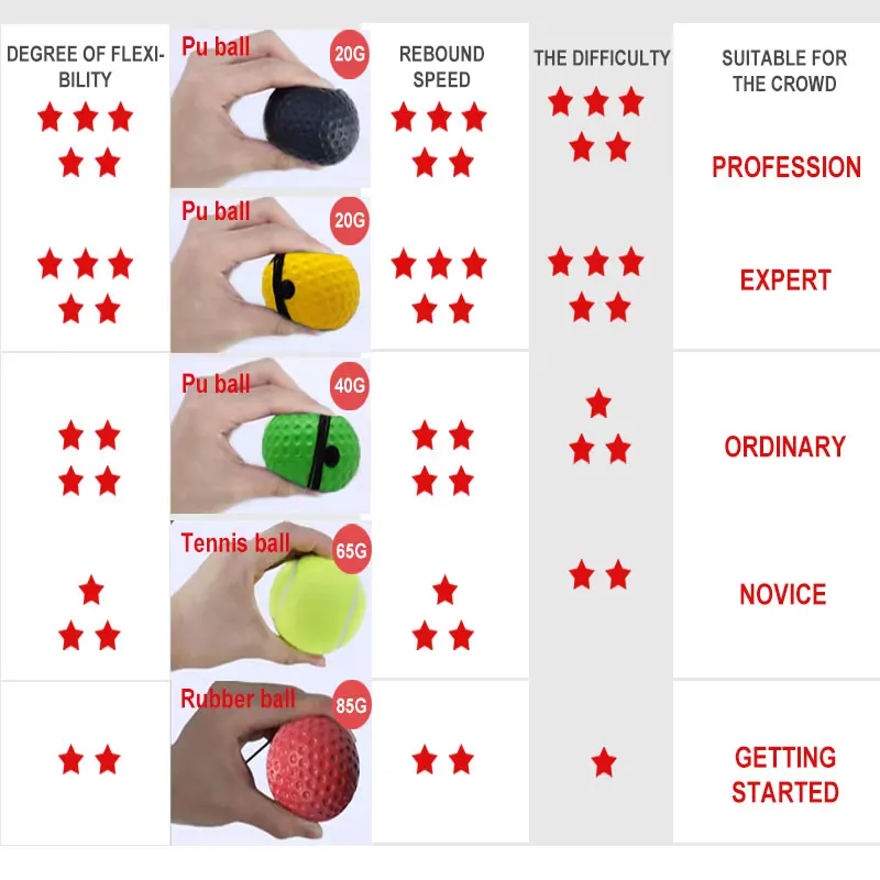 Повязки на голову: 20 г ПУ мяч: Лучшая мягкость. Лучшая эластичность и быстрая скорость отскока. Подходит для профессиональной подготовки или детских игр. 40 г ПУ мяч: лучше мягкость. Эластичность лучше, а скорость восстановления немного выше. Подходит для опытных тренировок 65 г теннисный мяч: средняя мягкость. Умеренная эластичность и средняя скорость отскока. Подходит для тренировки на уровне начинающих. 85 г резиновый шарик: худшая мягкость. Эластичность средняя, скорость отскока медленная. Подходит для обучения в первый раз.