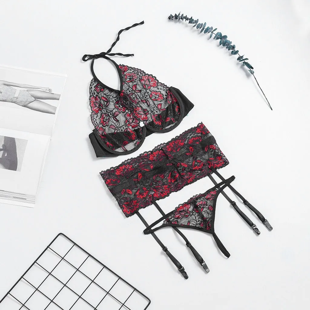 Сексуальное нижнее белье, чувственный бюстгальтер, трусы, комплект с подвязками, женское кружевное нижнее белье с цветочной вышивкой, Женский сетчатый прозрачный эротический костюм с лямкой на шее