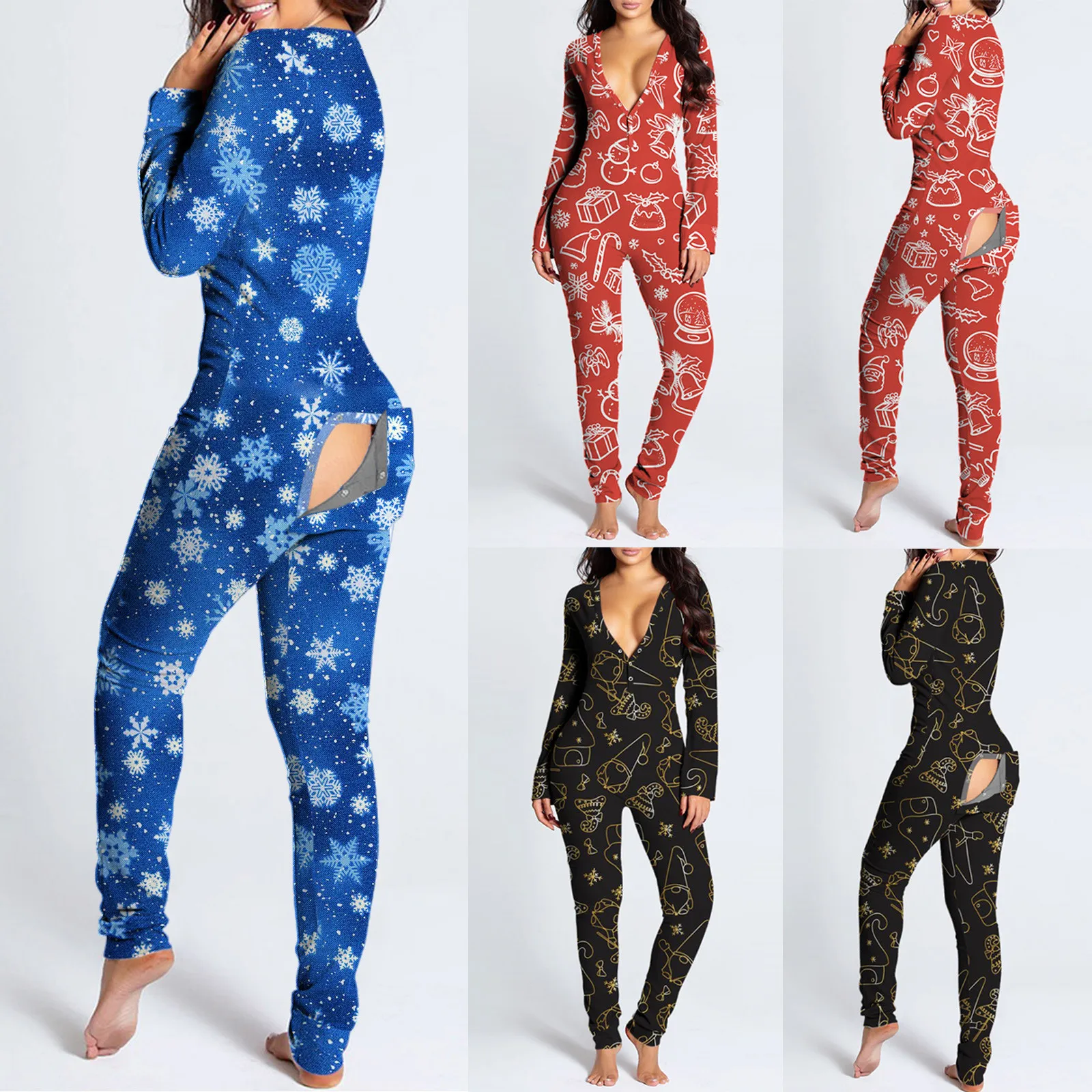 Женский Пижамный комбинезон с рождественским принтом, пикантный комбинезон в стиле ретро, женская пижама с открытыми ягодицами, Рождественский комбинезон