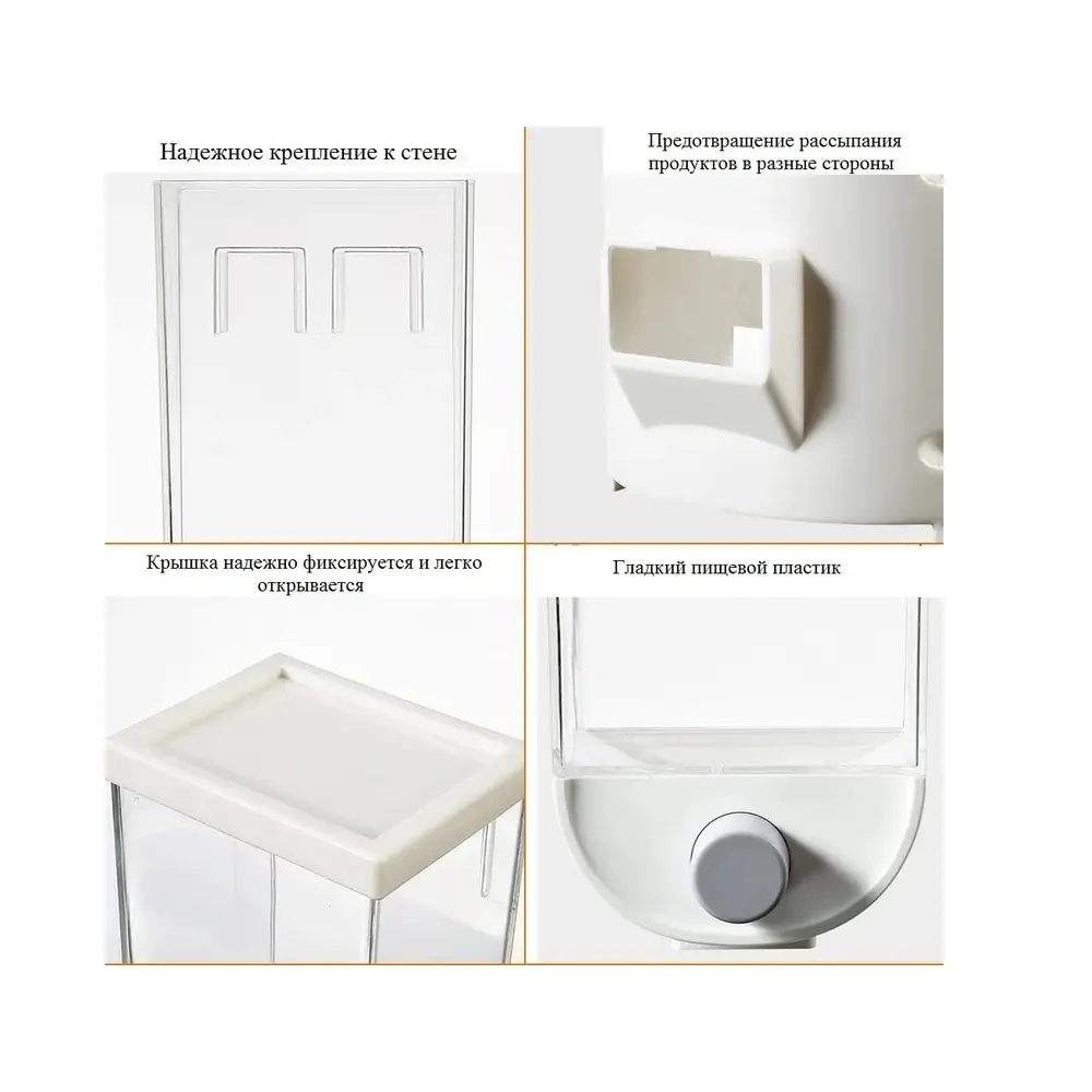 Настенный контейнер для сыпучих продуктов с дозатором – практичный дозатор настенного применения для экономии домашнего пространства. Выполнен и высококачественного пищевого пластика, прозрачный дизайн помогает контролировать наполненность диспенсера продуктами, а так же его легкую очистку.Многофункциональное использование, можно хранить различные крупы, кофейные зерна, бобы, сахар, хлопья, приправы, орехи и другое. Оптимальный объем - 1,5 литра. Идеально подходит для использования, как в домашних условиях, так и в небольших ларьках и магазинах для фасовки сыпучих продуктов.Легкое использование, благодаря простому механизму, просто нажать на кнопку и подставить емкость для продукта. Удобно контролировать количество насыпаемого продукта. Технические характеристики:Материал: пищевой пластик АВС.Размеры: 25*11,5*9 см.Объем: 1,5 л.Цвет: белый + прозрачный.Комплектация:Настенный пищевой Контейнер-Дозатор: 1 шт.,Самоклеящееся крепление к стене: 1 шт.