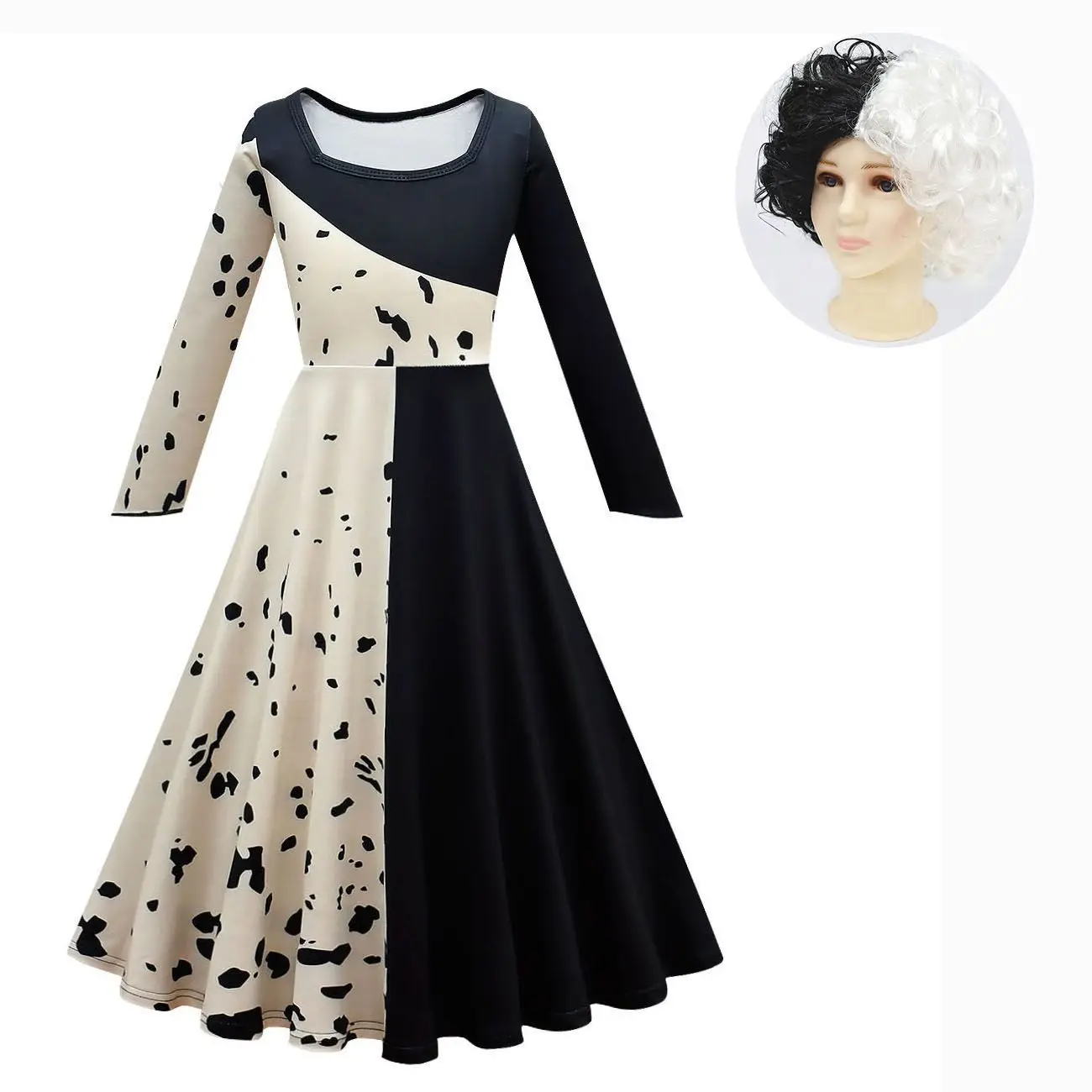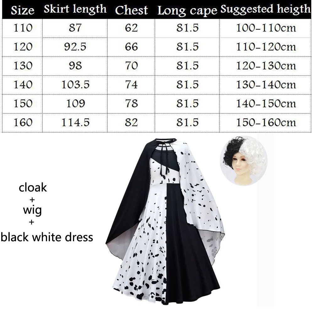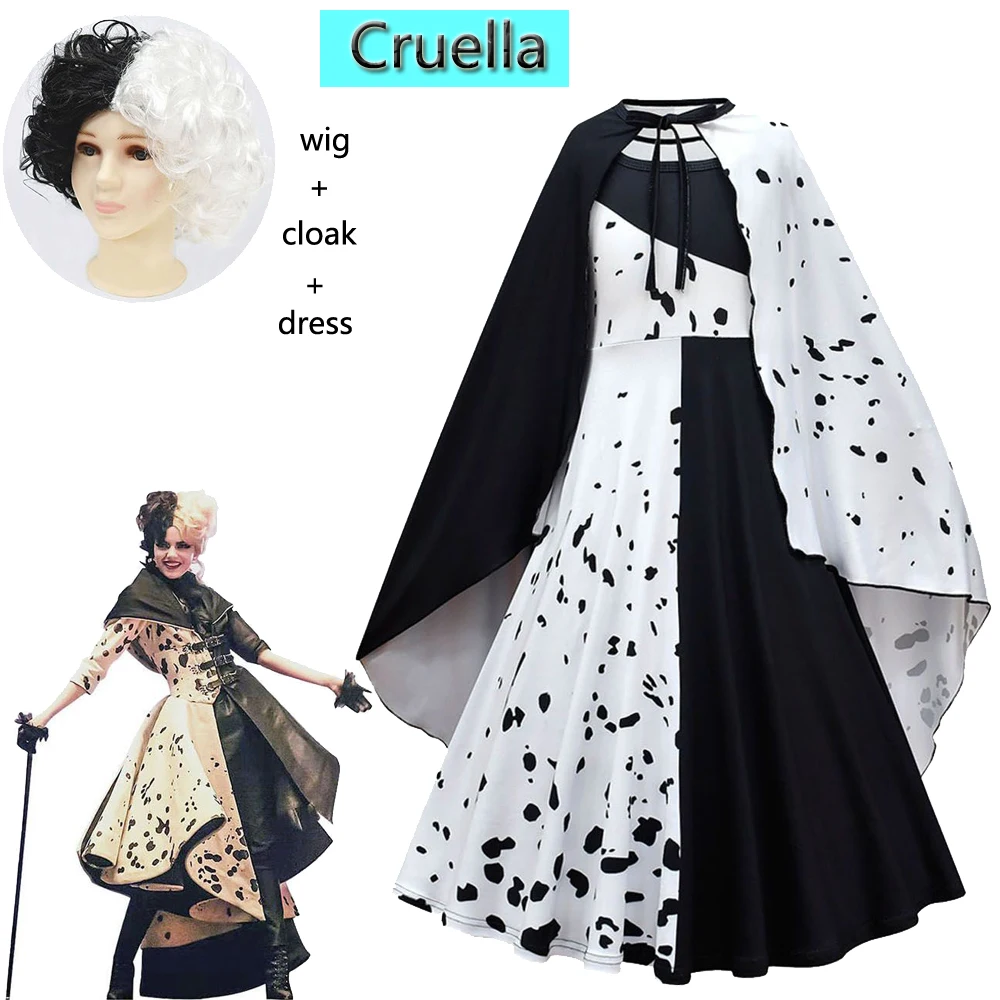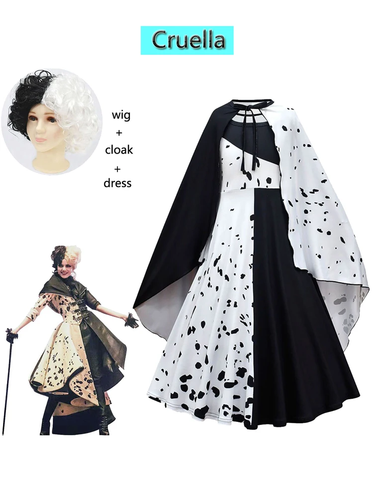 Новинка 2021, костюм для косплея злых мадам кроелла де Виль из фильма, детское платье, черное, белое, искусственное платье для вечеринки с накидкой, парик