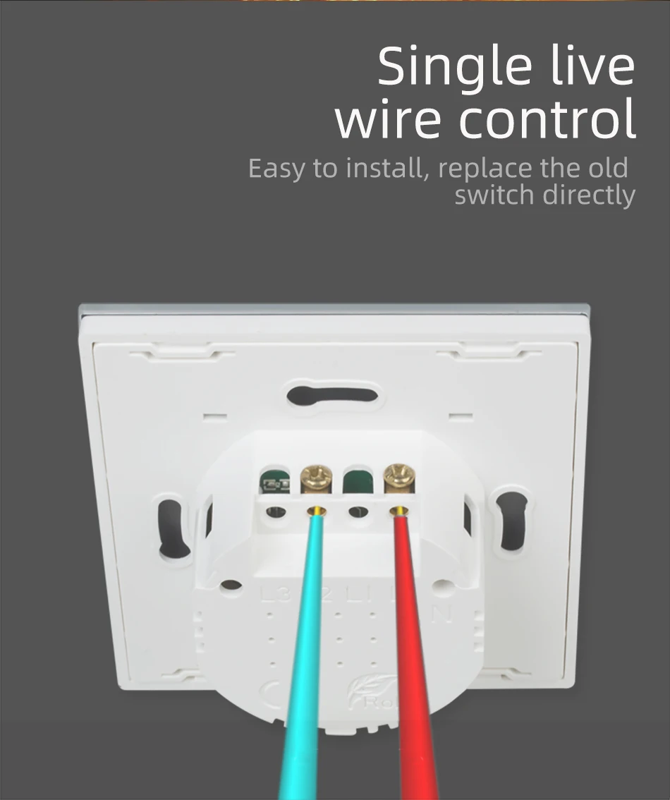 Одножильный провод управления, прямая замена оригинального старого переключателя.1. Снимите панель с помощью отверткиСнимите переднюю панель, как показано на рисунке ниже.2. Подключите проводПодключите провод к L терминалу.Подключите нейтральный провод Светильник для светильник терминал (L1,L2, L3 и т. д.).3. Установите переключатель на стенеПоместите переключатель на стену; Установите переднюю панель. Завинтите обе стороны; Установка завершает