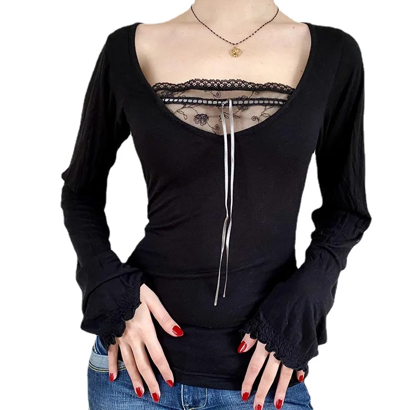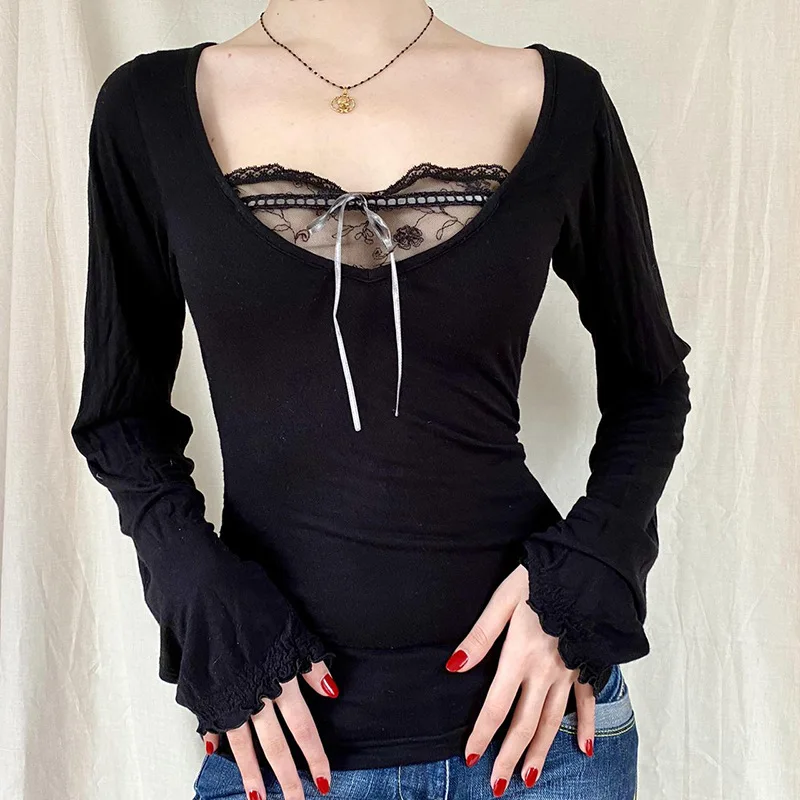Y2K Топ, кружевные укороченные женские футболки с бантом и оборками, милые черные женские футболки с V-образным вырезом и длинным рукавом, женские сексуальные топы, винтажные женские пуловеры