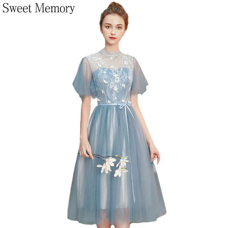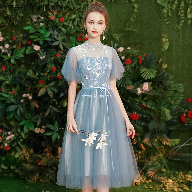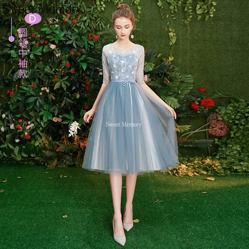 Женское платье подружки невесты O99U340, серое и голубое элегантное платье с коротким рукавом для гостей на свадьбе, платье из тюля длиной до колена для девочек, Vestido De Festa